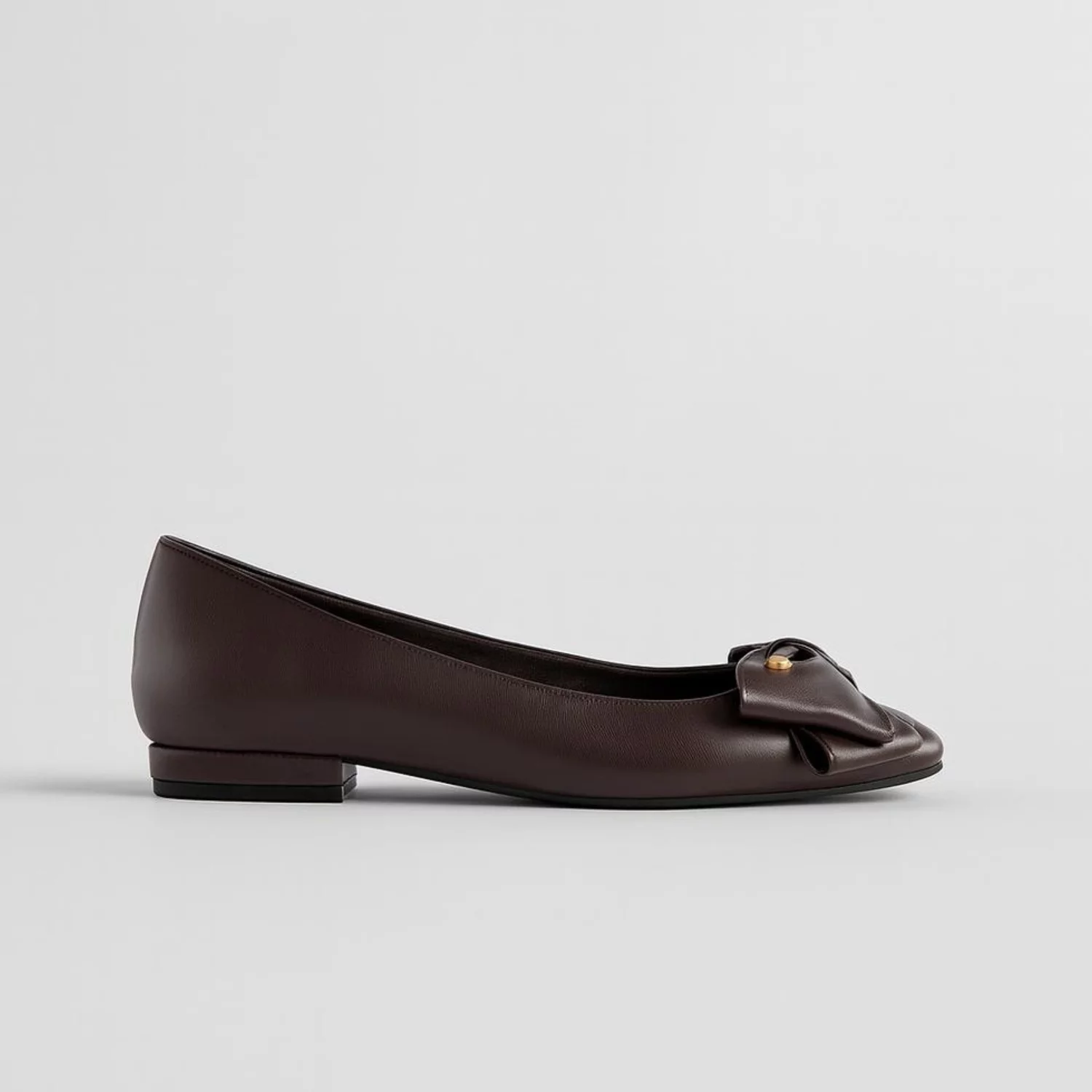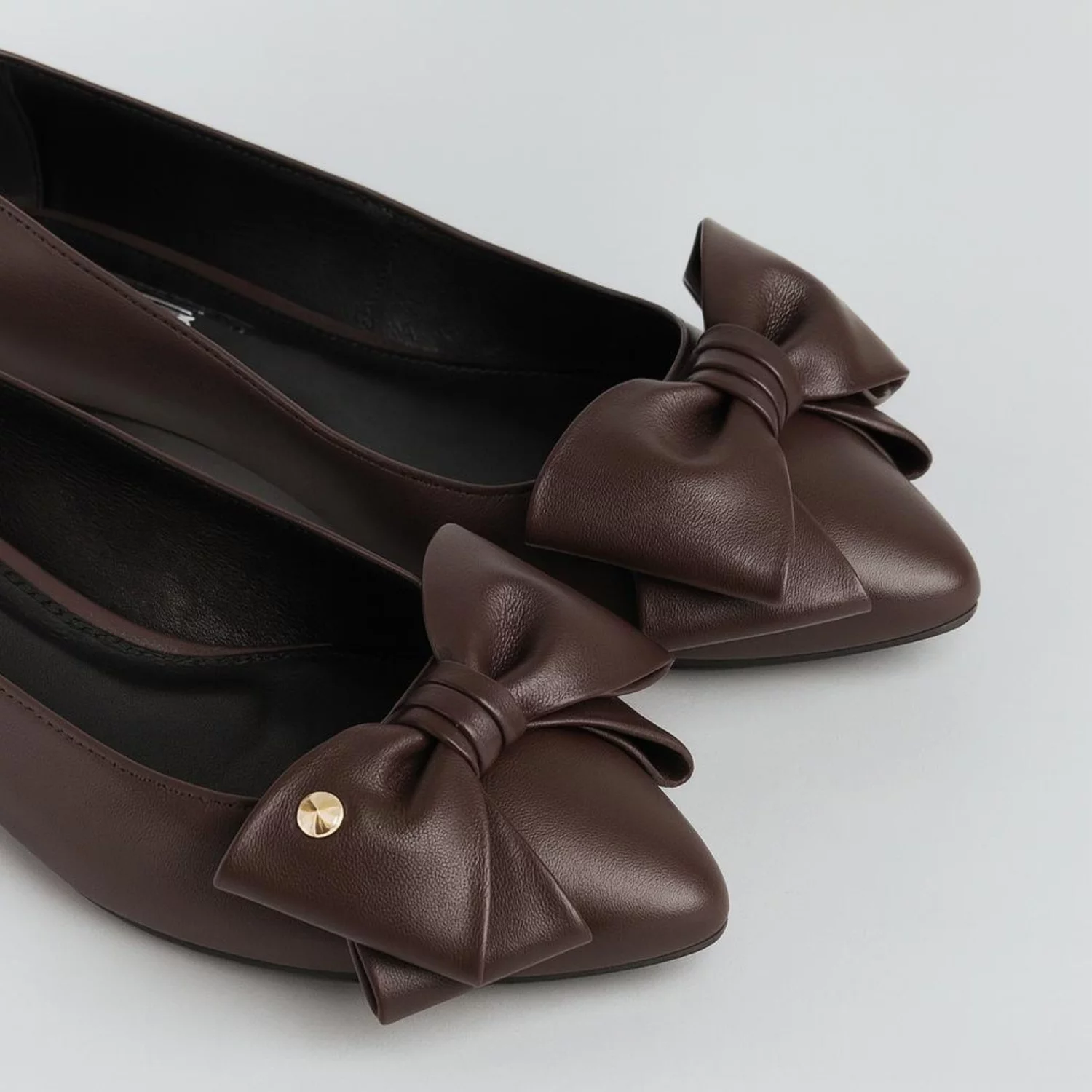 Balerini damă piele naturala maro ciocolata și fundă decorativă. Confortabili, eleganți și ideali pentru ținute casual-chic sau office.