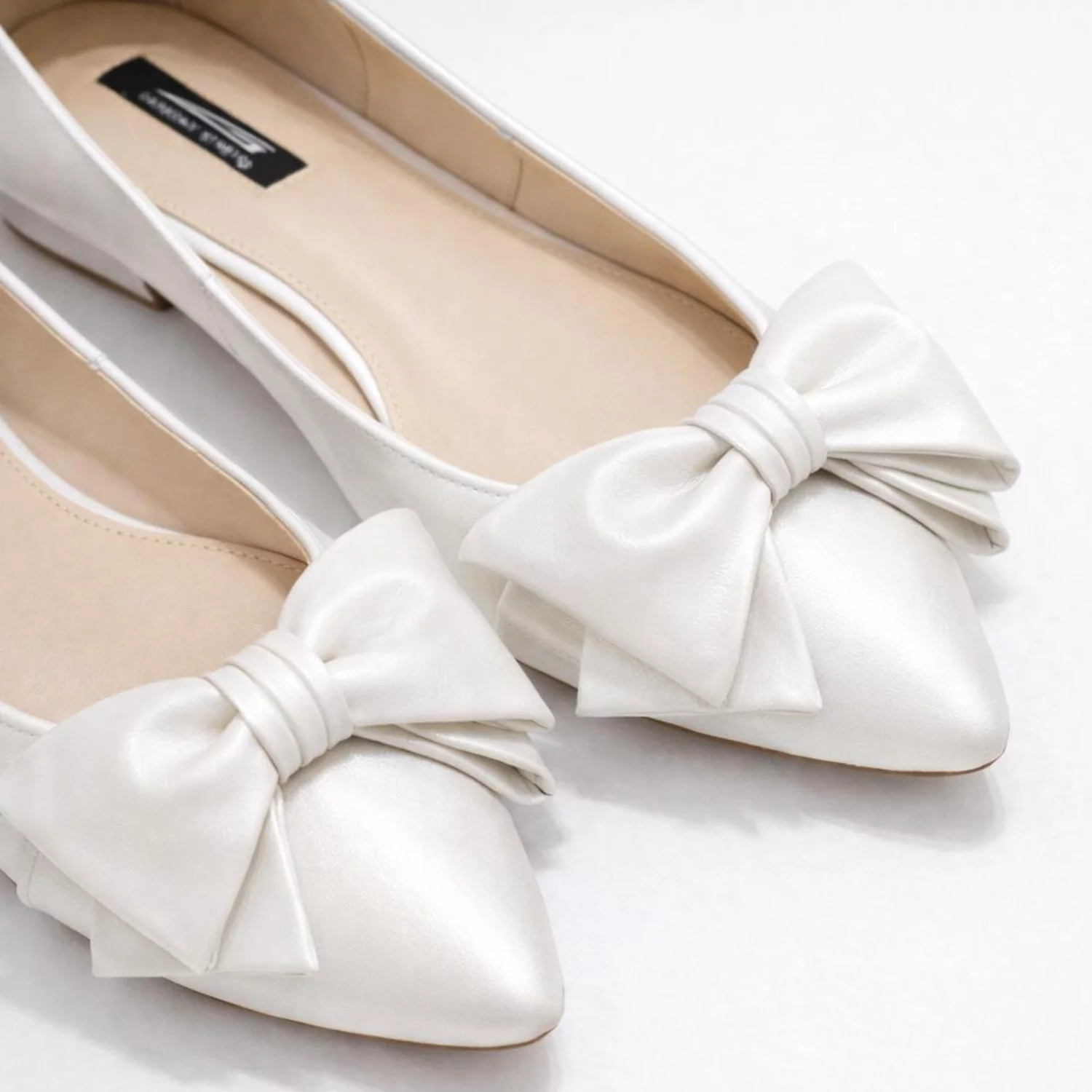 Balerinii Alisia cu fundă sunt realizați din piele naturală box alb sidefat, oferind un design elegant și delicat, potrivit pentru ținute casual sau chic. Modelul este pus în valoare de funda decorativă superbă, care adaugă un plus de feminitate și rafinament.