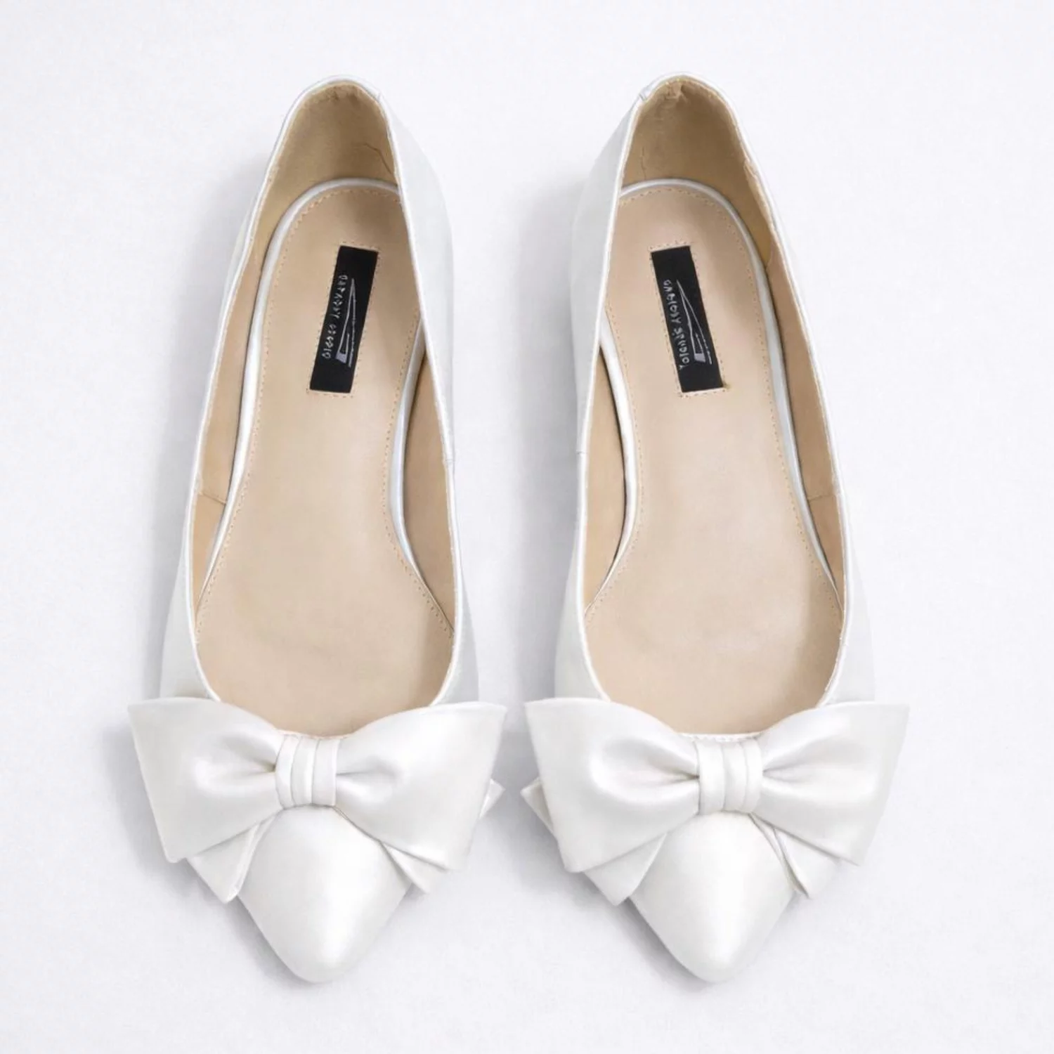 Balerini din Piele Naturala Alb sidefata cu funda Alisia