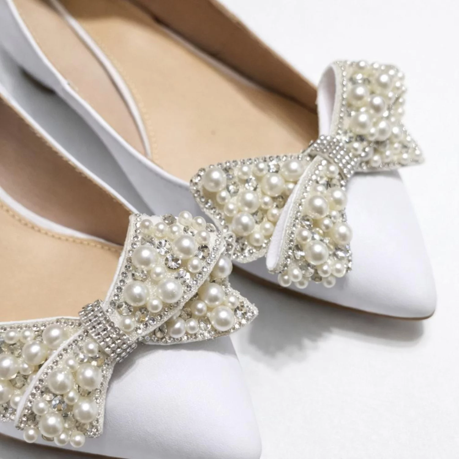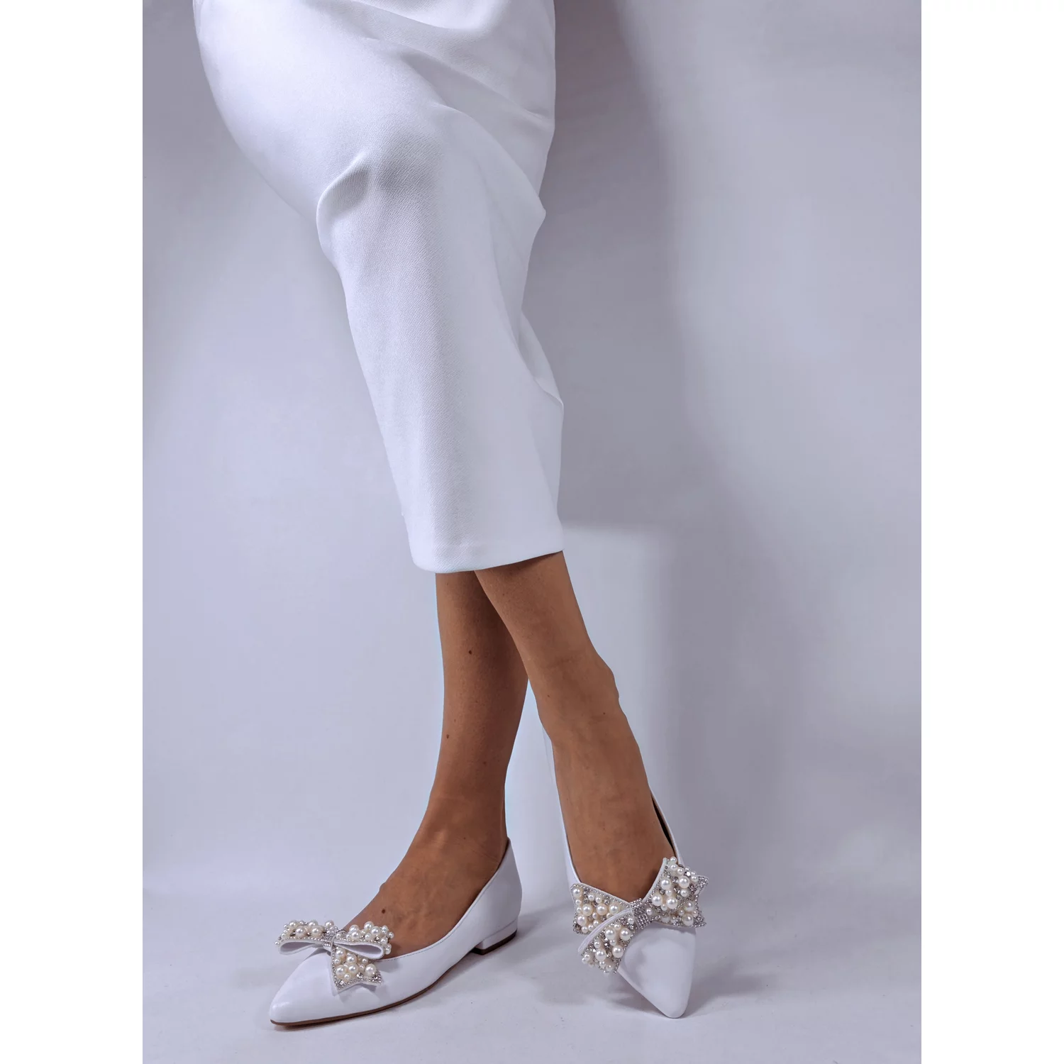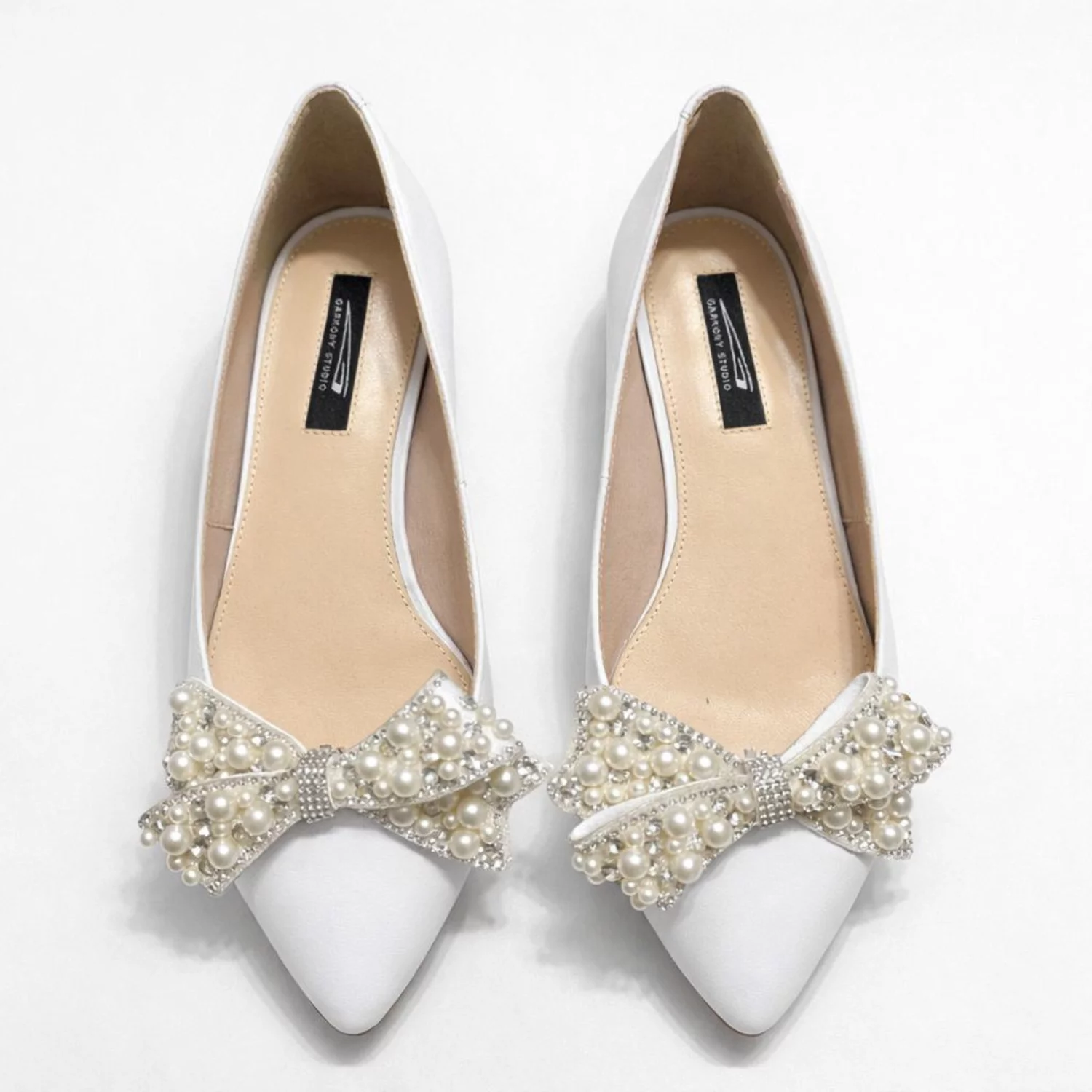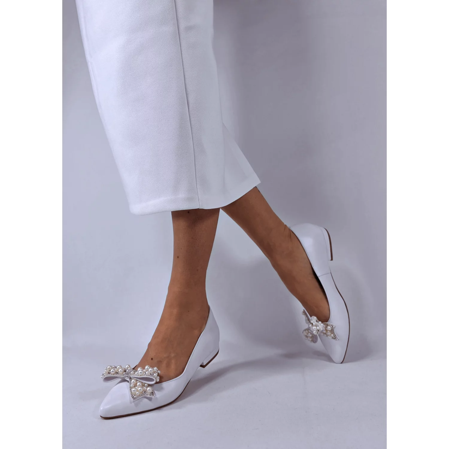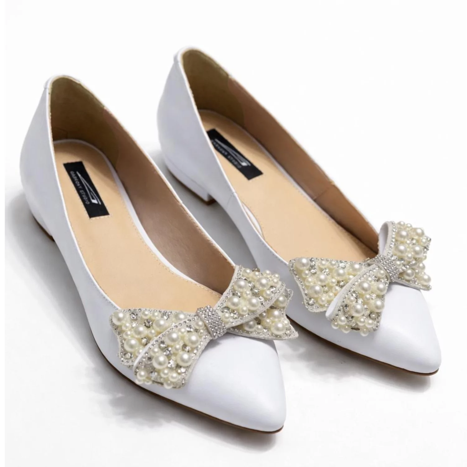 Balerini decupati din Piele Naturala alba accsorizati cu accesorii funde cu perle. Accesoriile sunt prinse cu cleme. Pot fi scoase si purtati balerinii simpli fara ele. Captuseala, fata si brantul balerinilor sunt din piele naturala. Brantul balerinilor este prevazut cu un buret special care ofera un plus de comoditate. Producator GARKONY