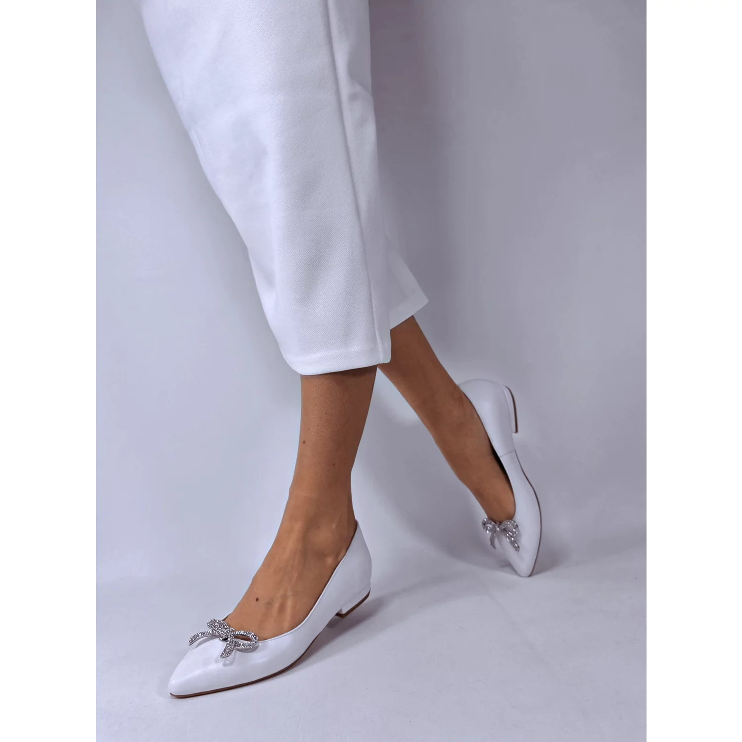 Balerini decupati din Piele Naturala alba accsorizati cu accesorii funde detasabile. Accesoriile sunt prinse cu cleme. Pot fi scoase si purtati balerinii simpli fara ele. Captuseala, fata si brantul balerinilor sunt din piele naturala. Brantul balerinilor este prevazut cu un buret special care ofera un plus de comoditate. Producator GARKONY