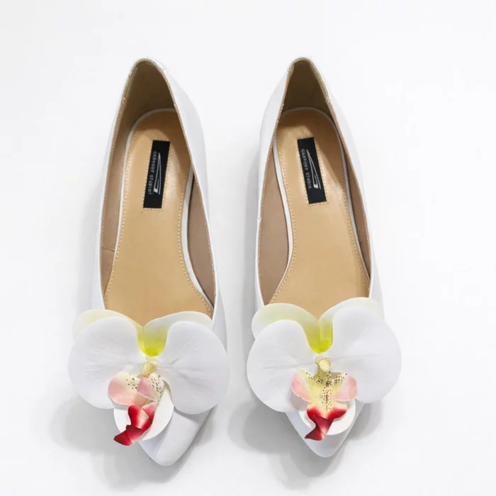 Balerinii Orchid din piele box alb sunt alegerea ideală pentru un look elegant, delicat și versatil. Parte din colecția nouă, modelul se remarcă prin accesoriul floral detașabil, care transformă instant pantofii dintr-un model minimalist într-o piesă statement.