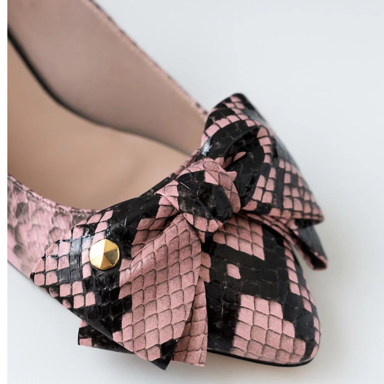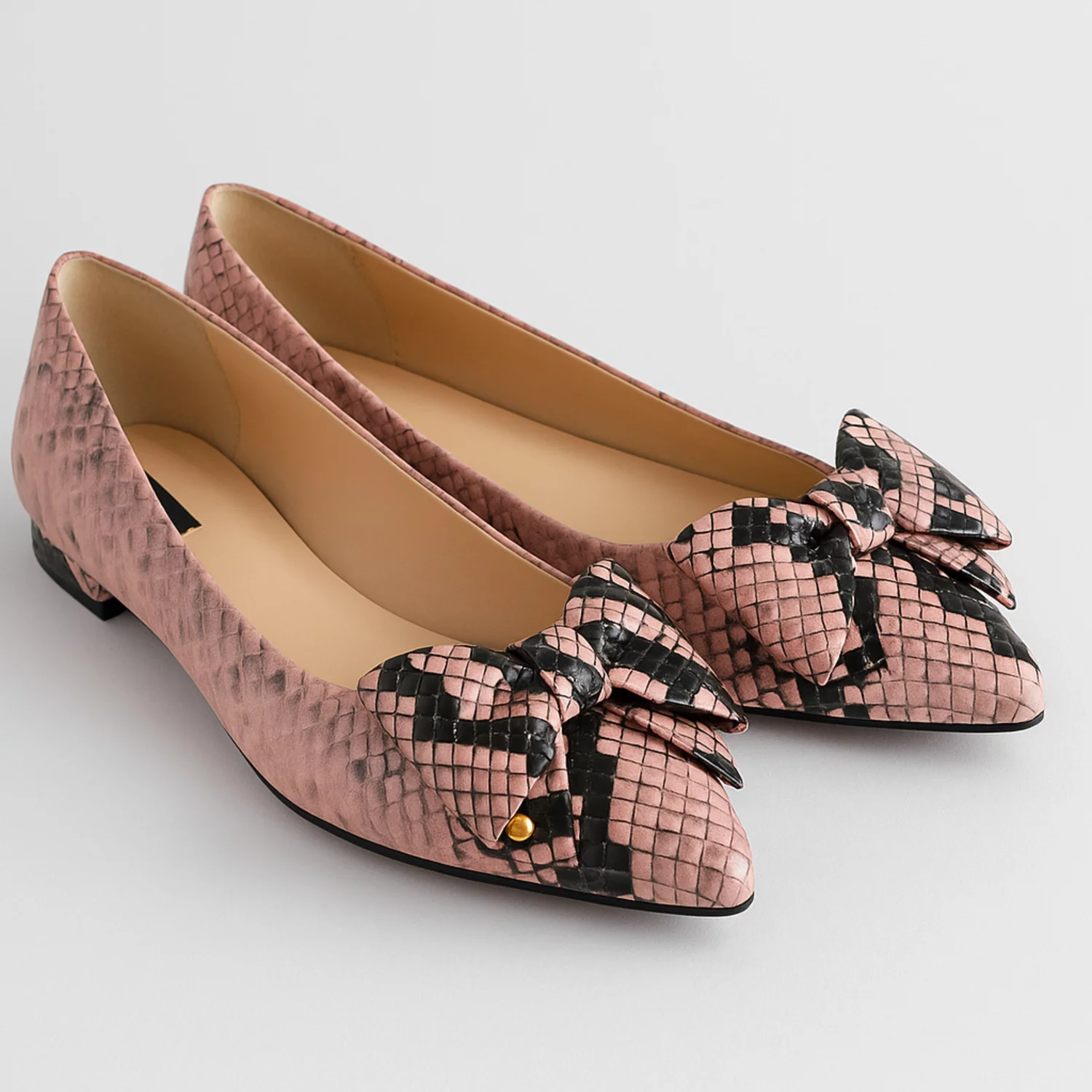 Balerini damă piele naturala roz cu imprimeu snake și fundă decorativă. Confortabili, eleganți și ideali pentru ținute casual-chic sau office.