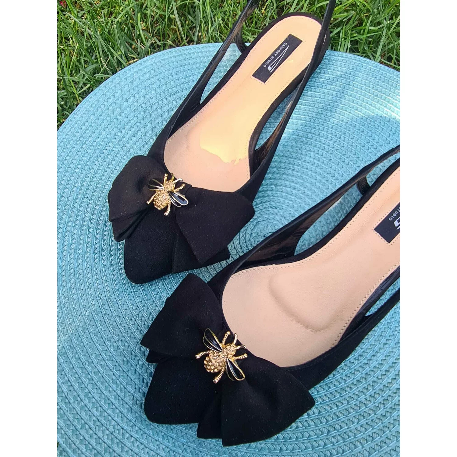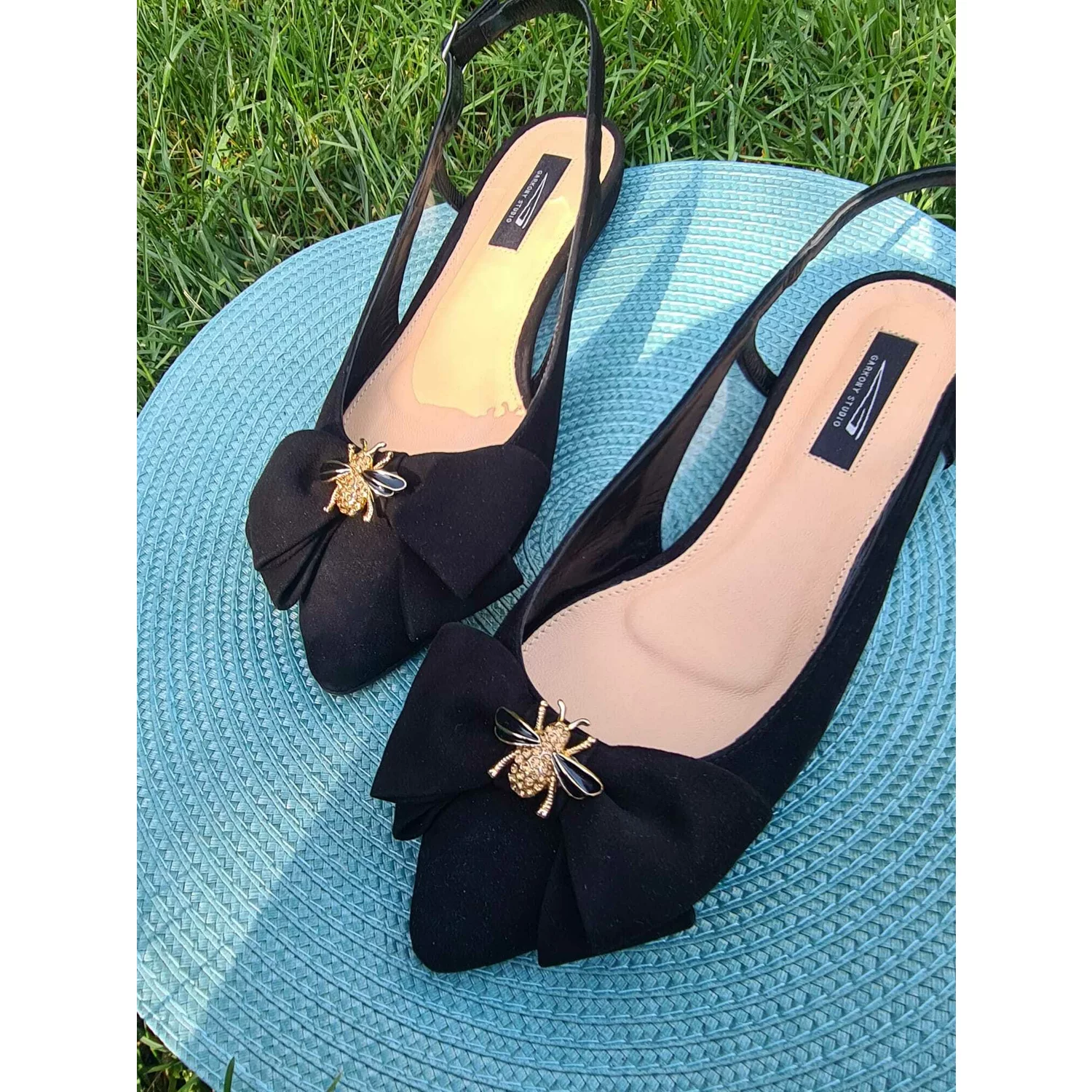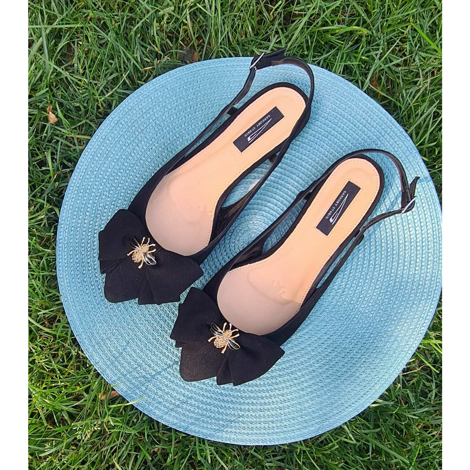 Balerini decupati din piele naturala camoscio negru accsorizati cu o funda mare si accesoriu. Balerinii sunt decupati in spate si se leaga cu bareta de picior. Captuseala, fata si brantul balerinilor sunt din piele naturala. Brantul balerinilor este prevazut cu un buret special care ofera un plus de comoditate.