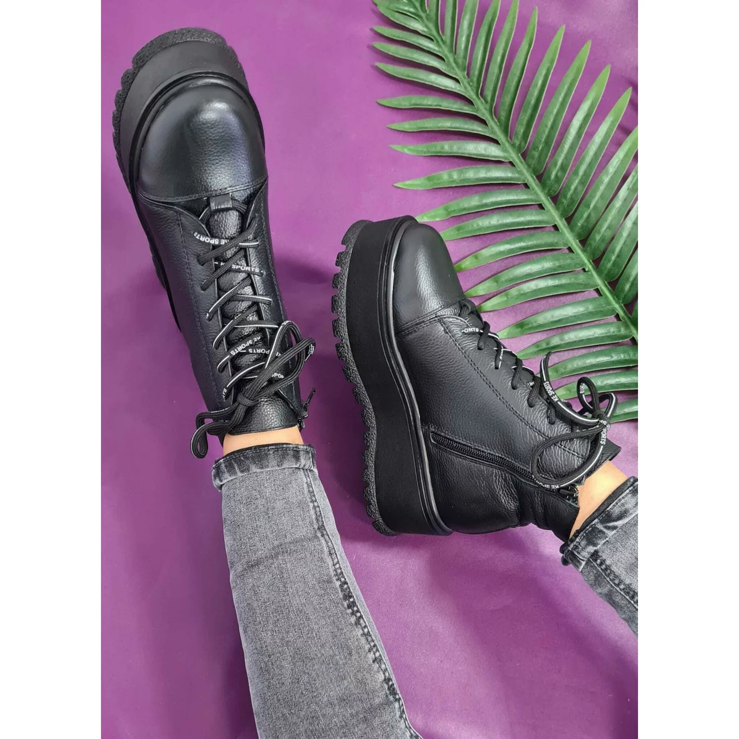 - Ghete casual de dama cu talpa platforms acesorizate cu siret negru. La interior fermoar functional.