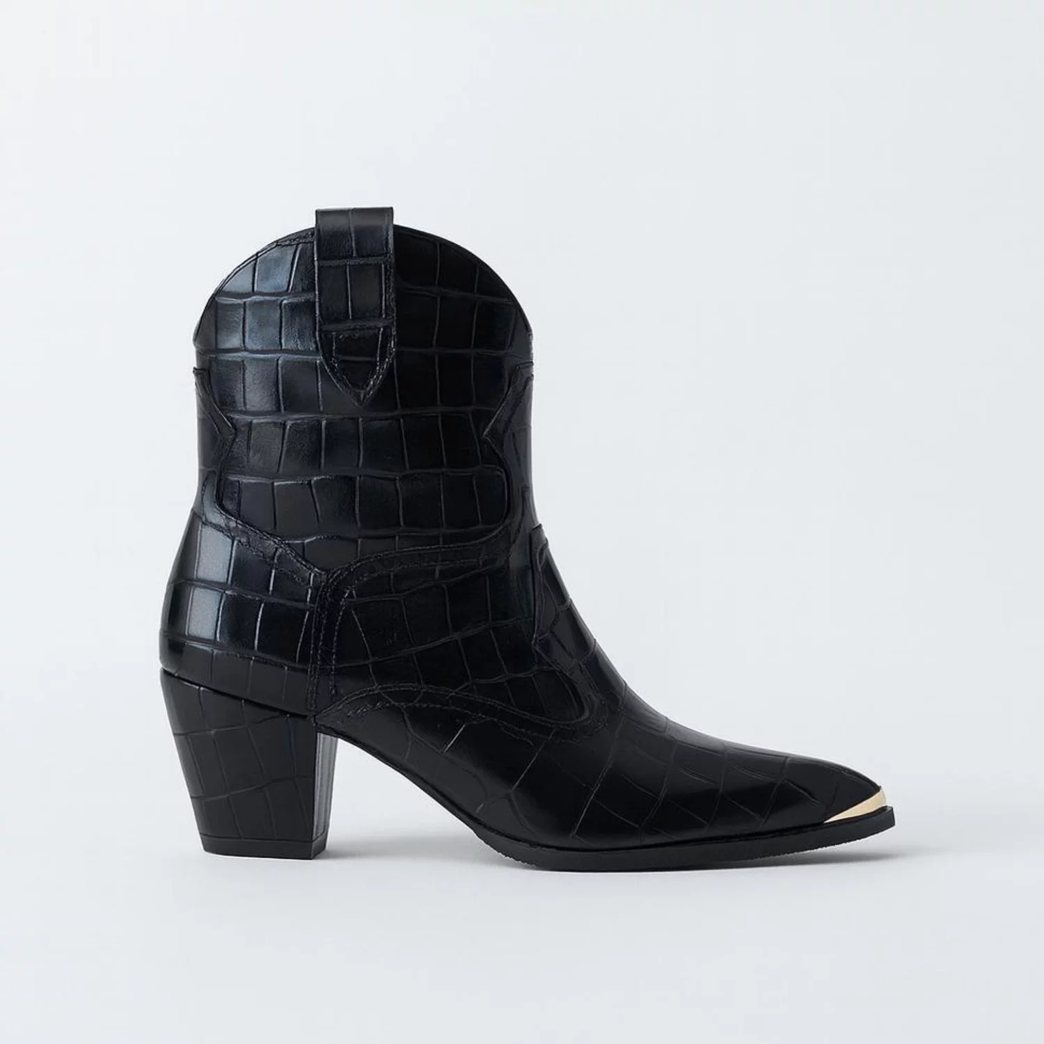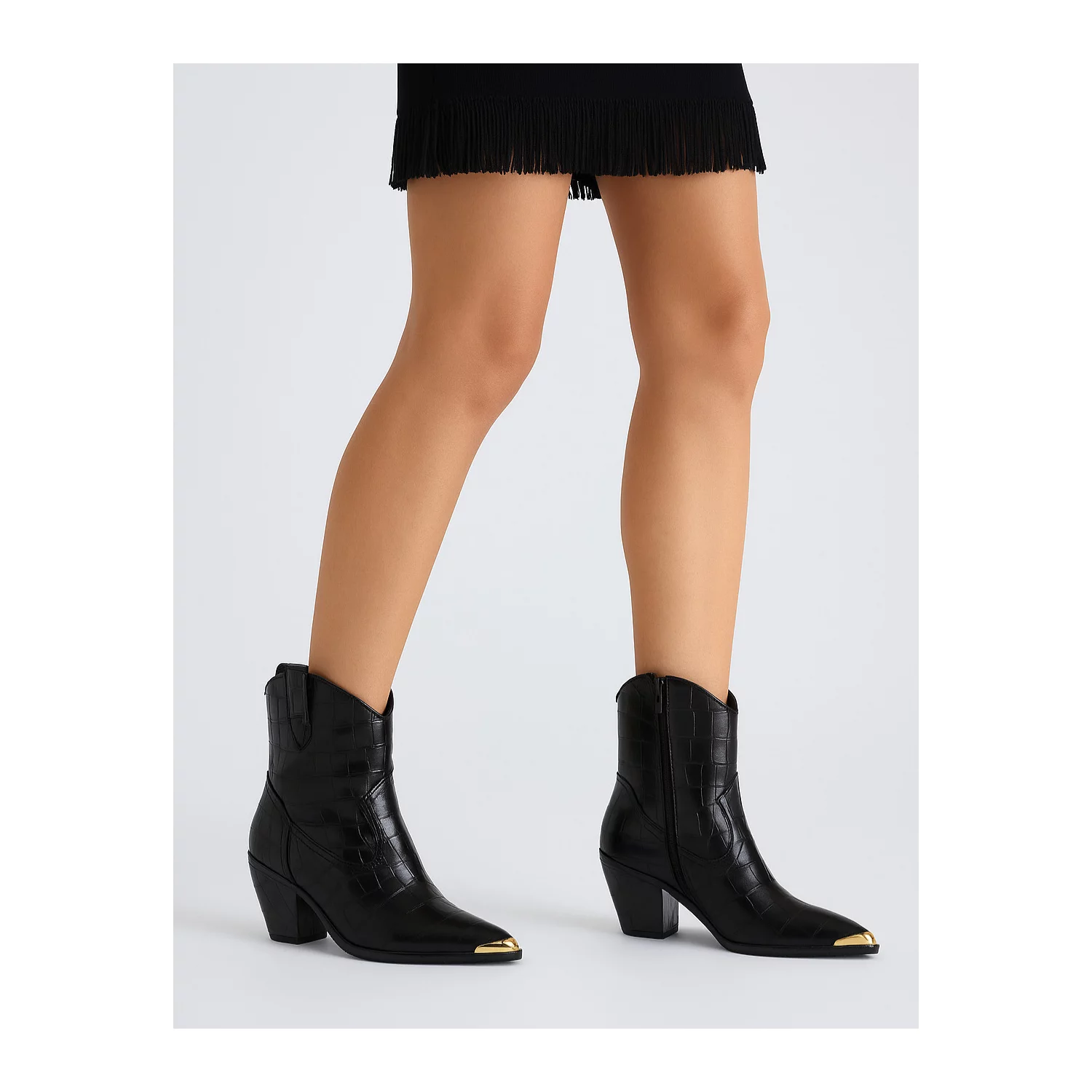 Botine damă western din piele naturală croco – negre, cu vârf metalic și toc mediu