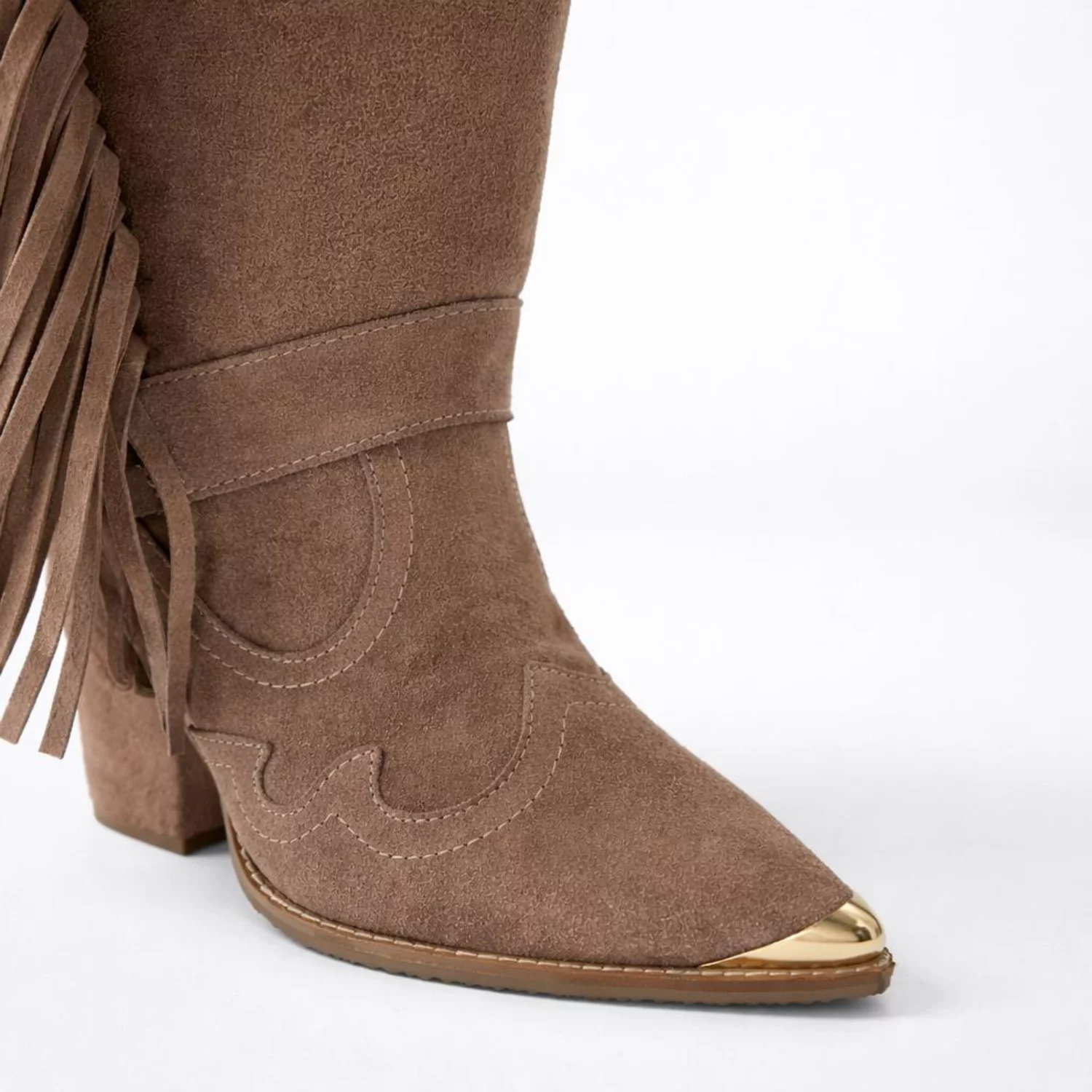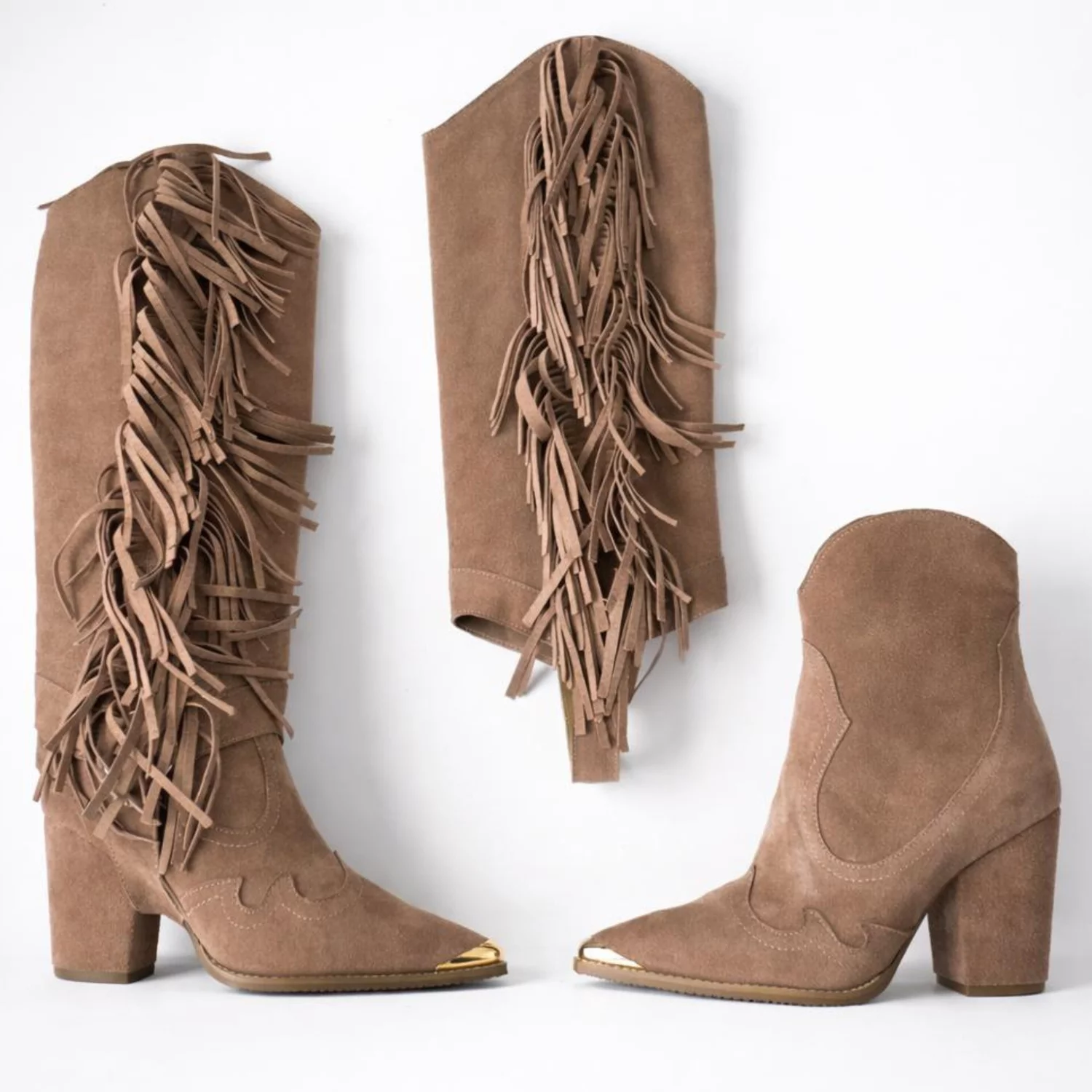 Cizme damă cu franjuri din piele naturală întoarsă velur bej capucino, cu vârf metalic și gambă detașabilă. Model 2 în 1: botine și cizme elegante, versatile și moderne
