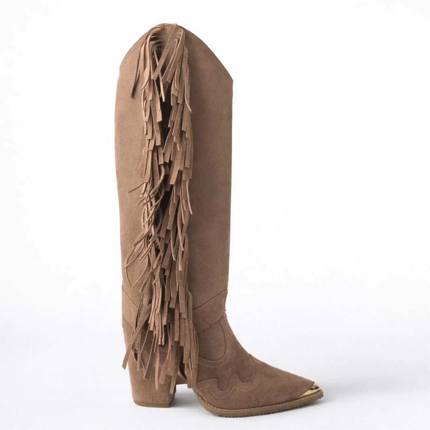 Cizme cu carambi detasabili Piele Naturala Velur Bej Capucino cu franjuri Dakota Jinx P