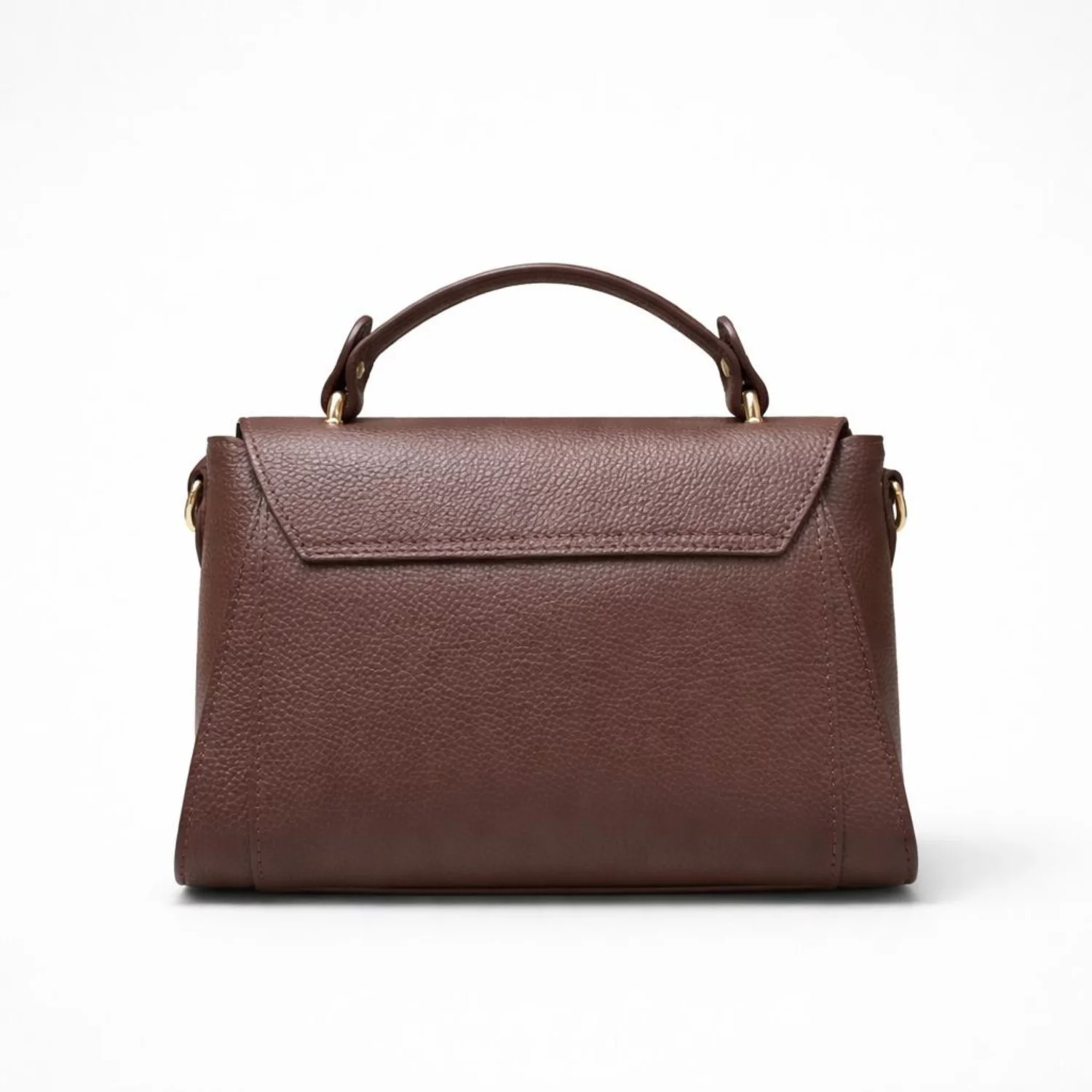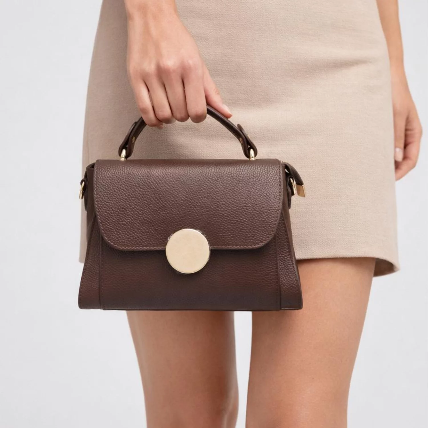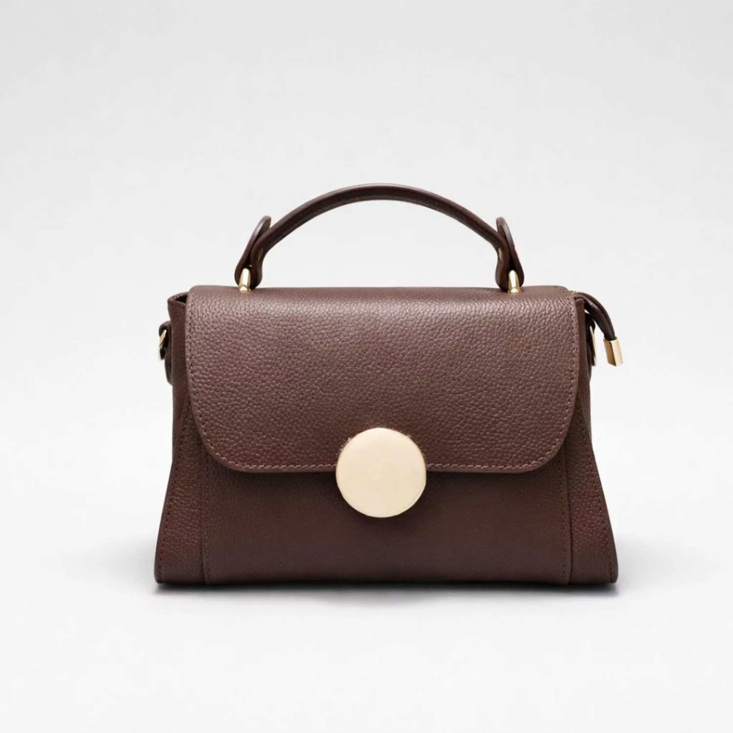 Sistemul de închidere este sigur și elegant, cu accesoriu frontal cu capsă și fermoar, protejând conținutul genții. Textura pielii bizonate și culoarea maro conferă un aspect rafinat, ușor de asortat în orice sezon.