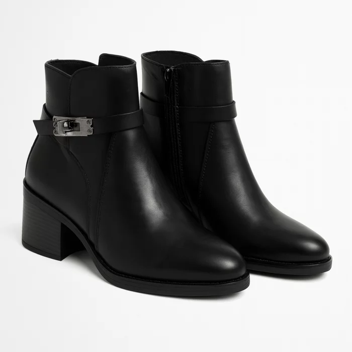 Botine damă din piele naturală, negre, cu toc mediu și cataramă metalică decorativă. Elegante, comode și ușor de asortat la ținute office sau casual.