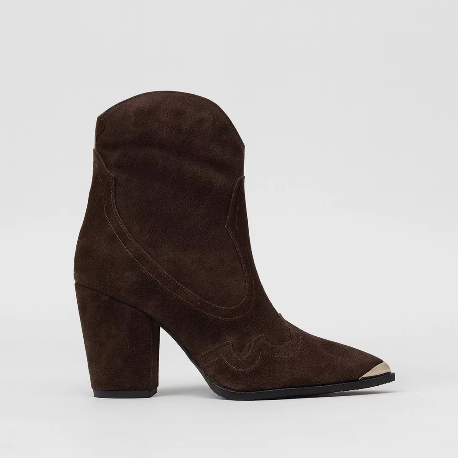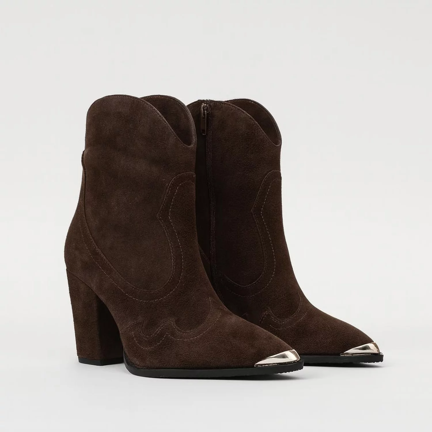 Adaugă un plus de stil garderobei tale cu aceste ciocate damă din piele naturală întoarsă, într-o nuanță elegantă de maro ciocolată. Lucrate din piele de calitate, aceste botine western se remarcă prin cusăturile decorative și vârful metalic sofisticat, care conferă un aer modern și rafinat.