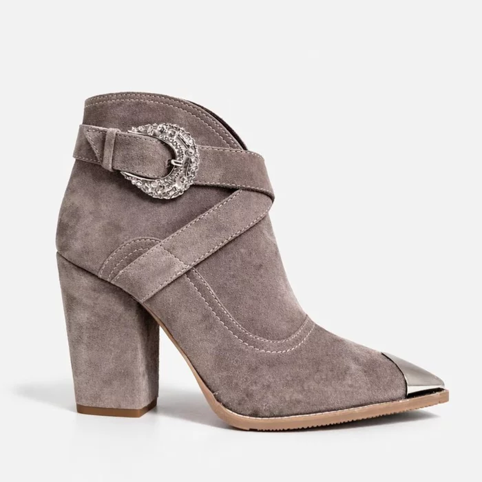 Realizate din velur moale și plăcut la atingere, ciocatele au un toc de 8.5–9 cm, care alungește silueta și oferă stabilitate datorită formei sale groase. Accesoriul metalic lateral adaugă personalitate și un aer sofisticat.