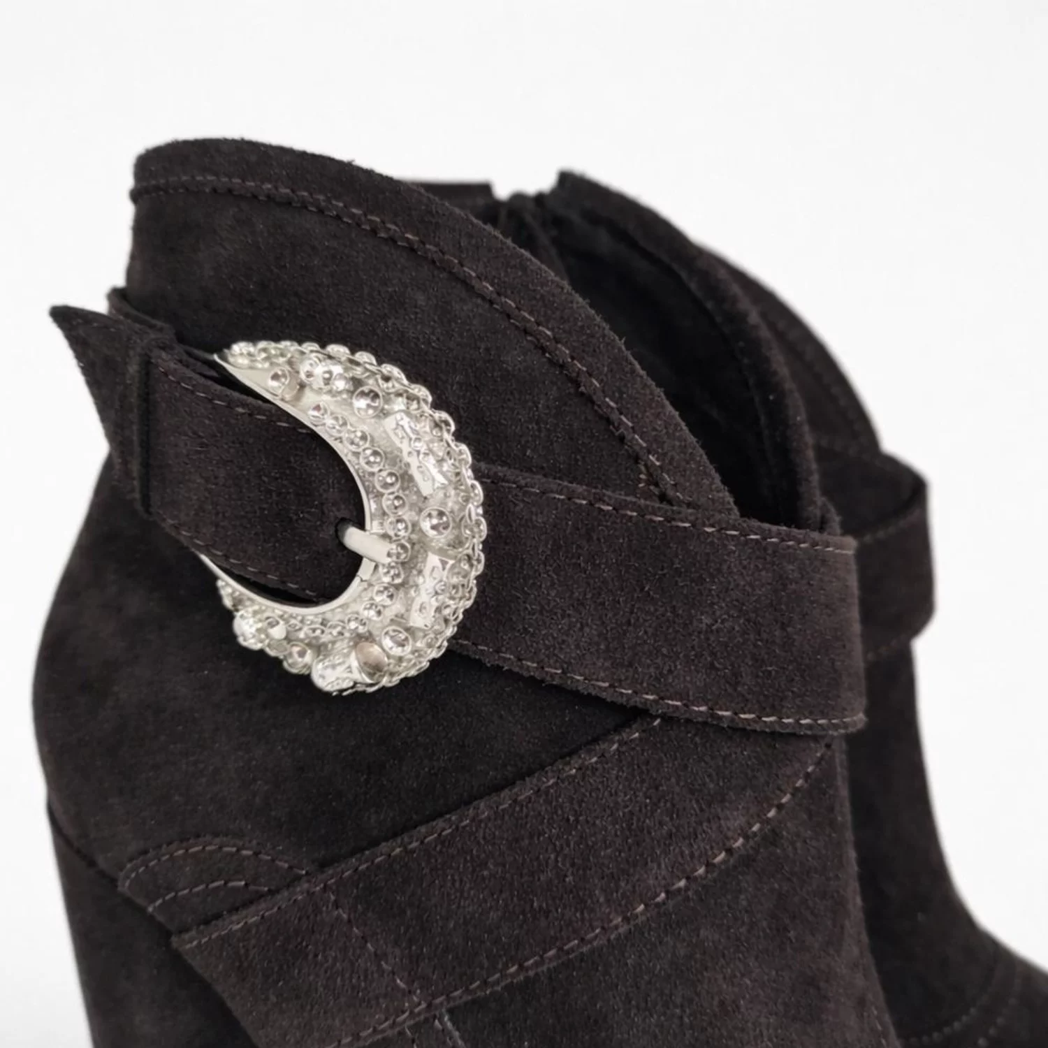 Realizate din velur moale și plăcut la atingere, ciocatele au un toc de 8.5–9 cm, care alungește silueta și oferă stabilitate datorită formei sale groase. Accesoriul metalic lateral adaugă personalitate și un aer sofisticat.
