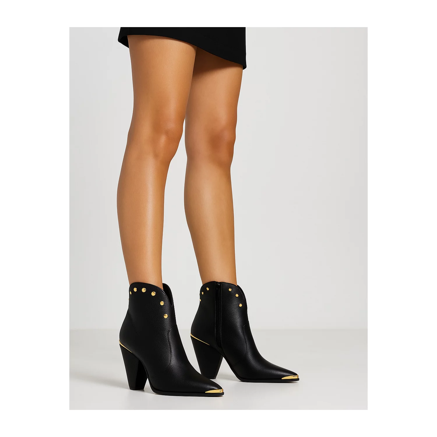 Descoperă eleganța și rafinamentul acestor botine negre din piele naturală pentru damă, lucrate manual cu atenție la fiecare detaliu în atelierul nostru. Designul modern este pus în valoare de vârful ascuțit cu inserție metalică și de aplicațiile cu ținte aurii, care adaugă un plus de stil și personalitate.