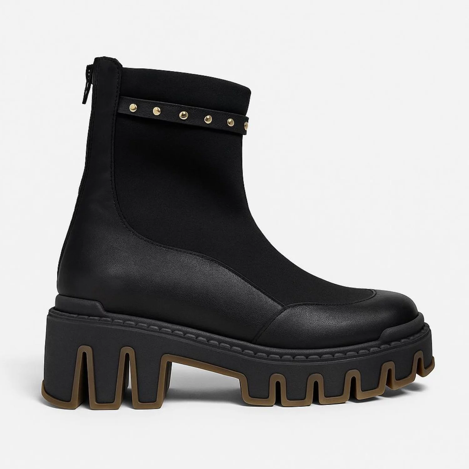 - Interiorul este complet căptușit cu blăniță moale, asigurând căldură și confort termic în zilele friguroase, iar fermoarul amplasat la spate facilitează o încălțare rapidă și elegantă. Talpa groasă, sculptată, oferă aderență, stabilitate și un look avangardist.