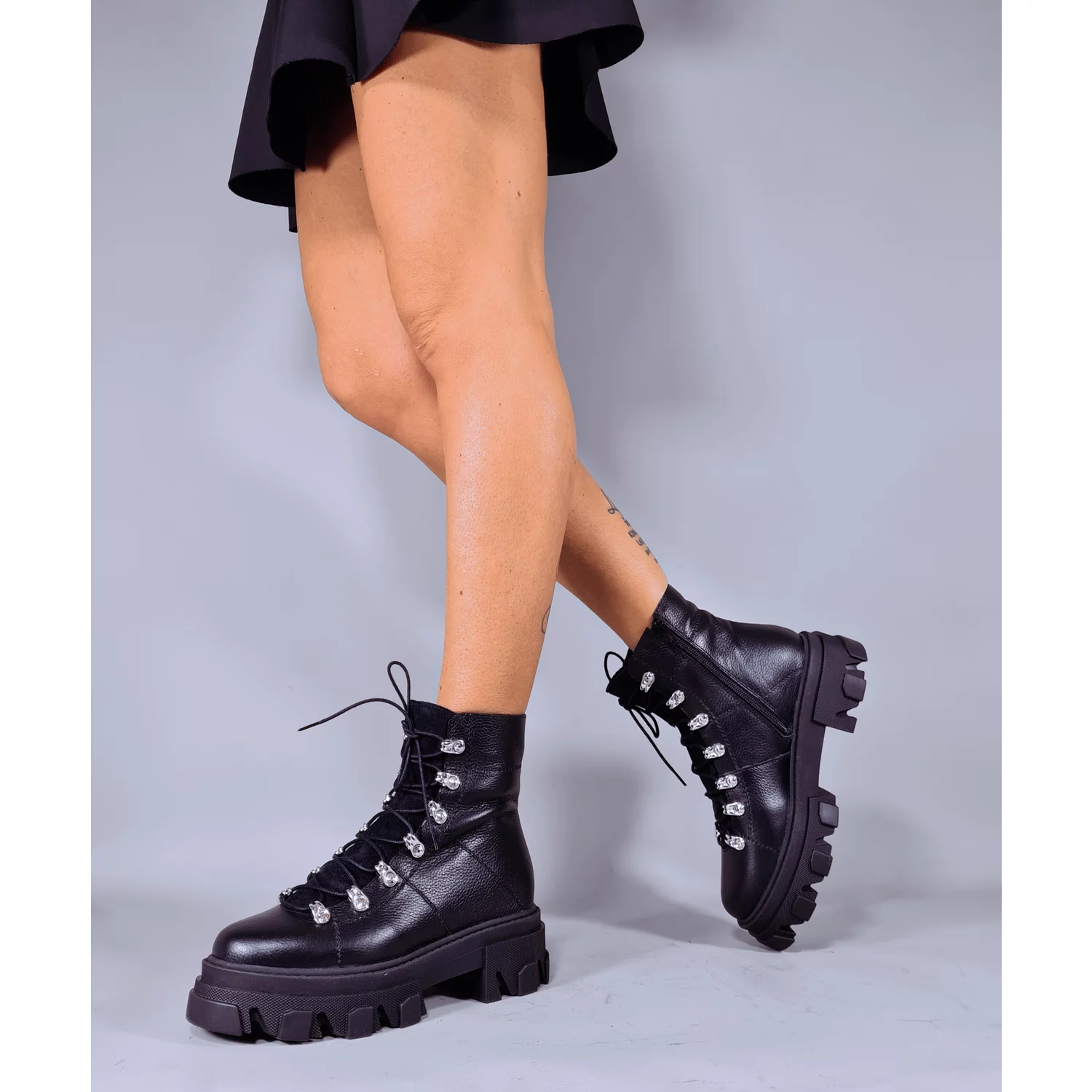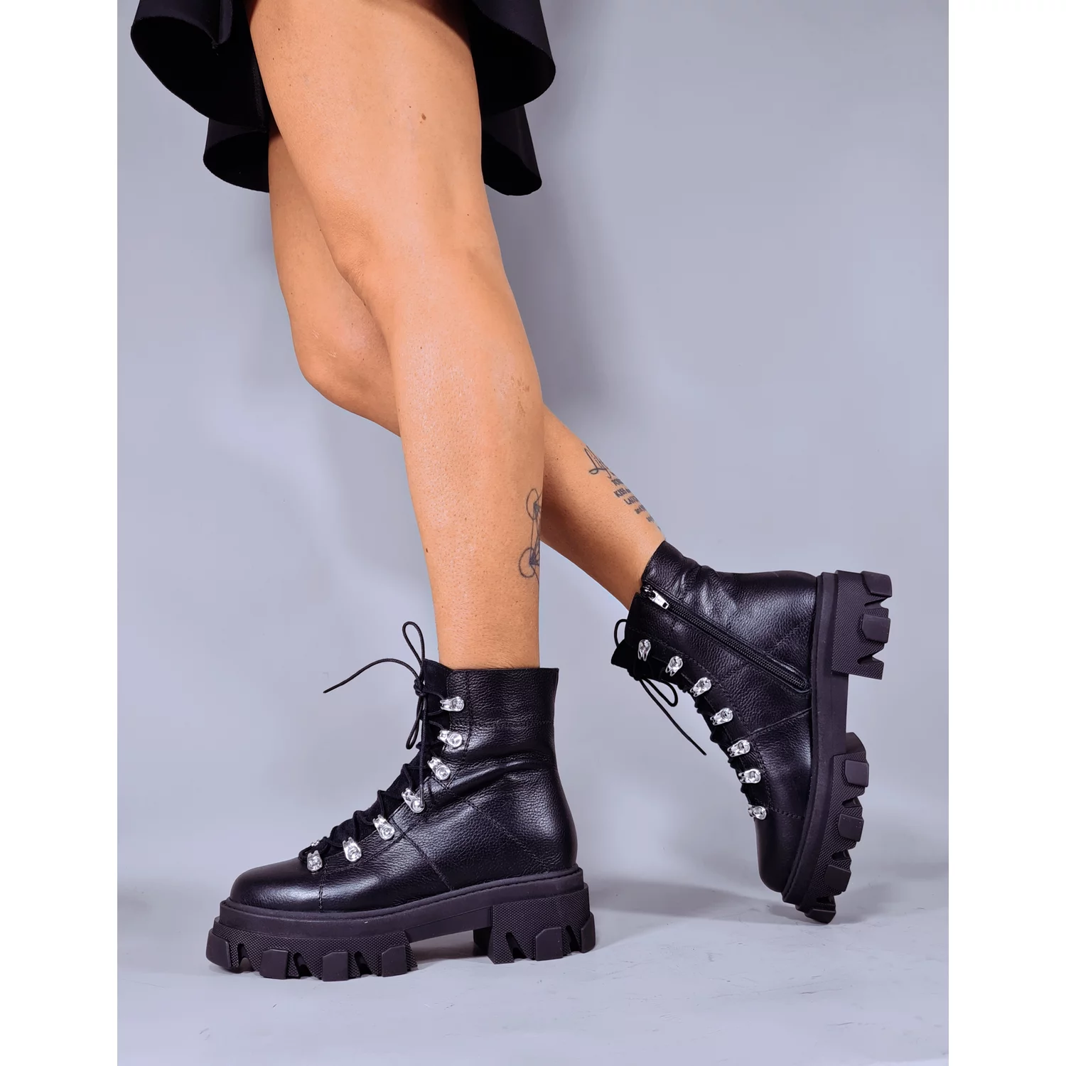 - Ghete de dama tip bocanci din piele naturala acesorizate cu carlige argintii si siret.