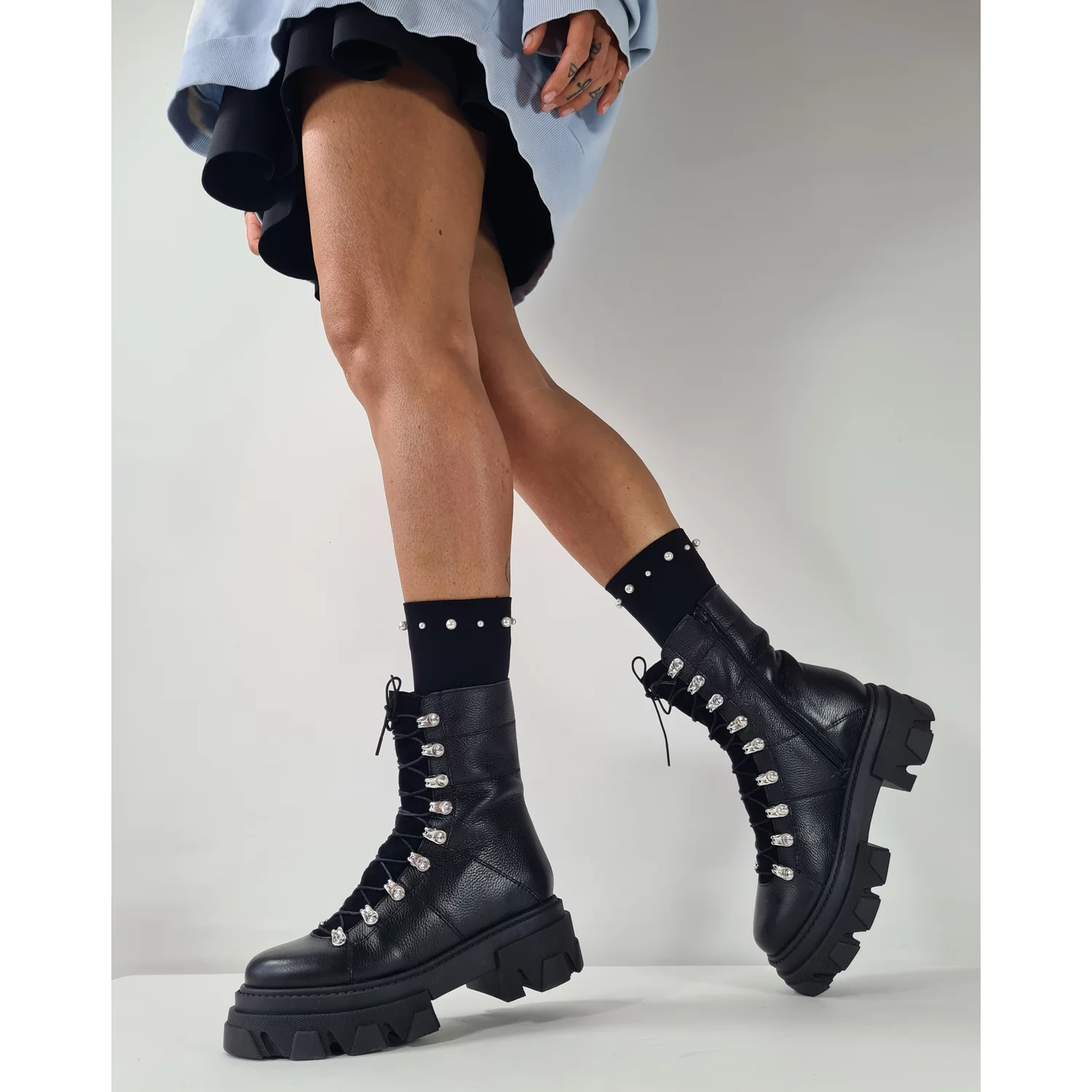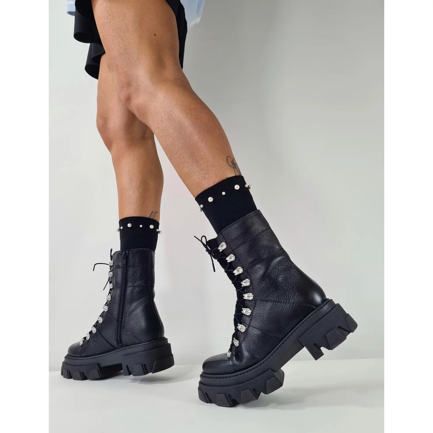 - Ghete de dama tip bocanci din piele naturala acesorizate cu carlige argintii si siret.