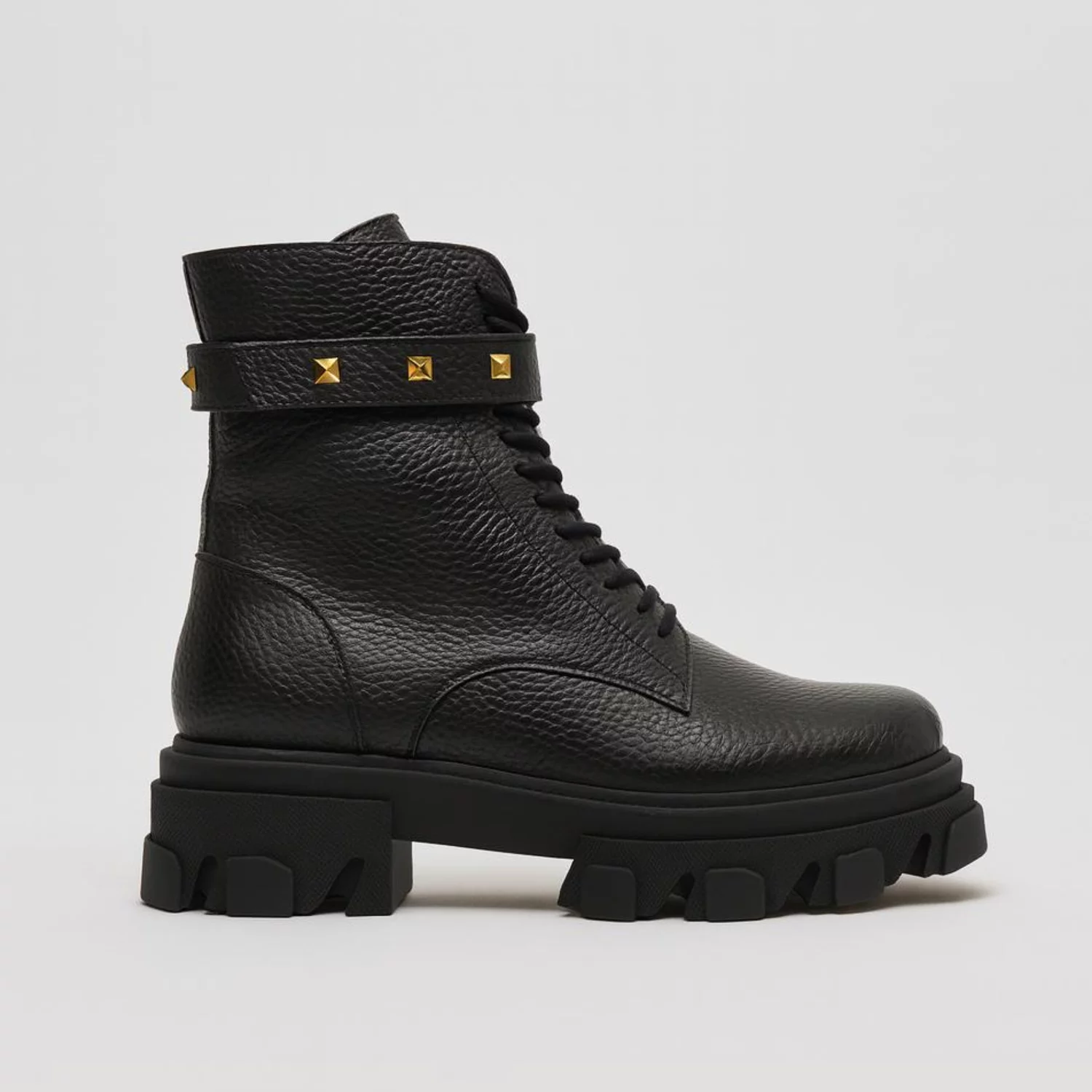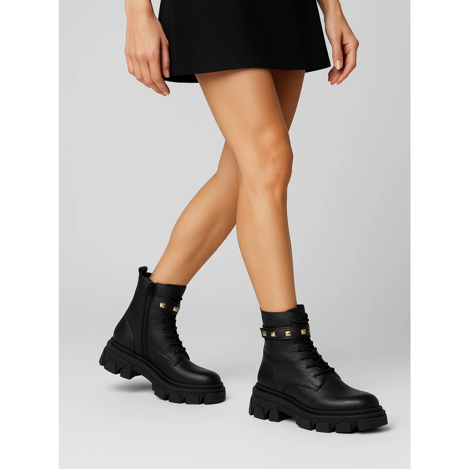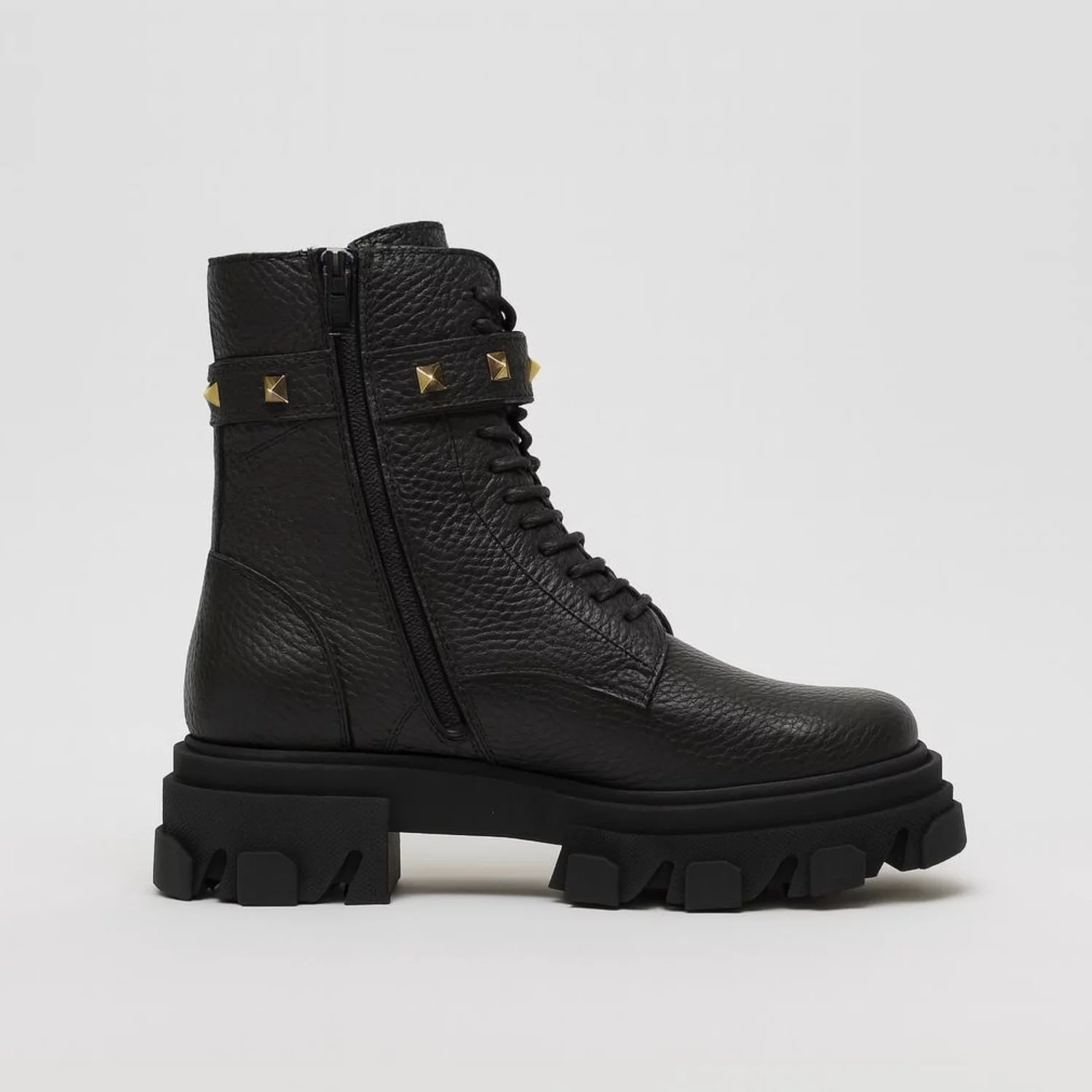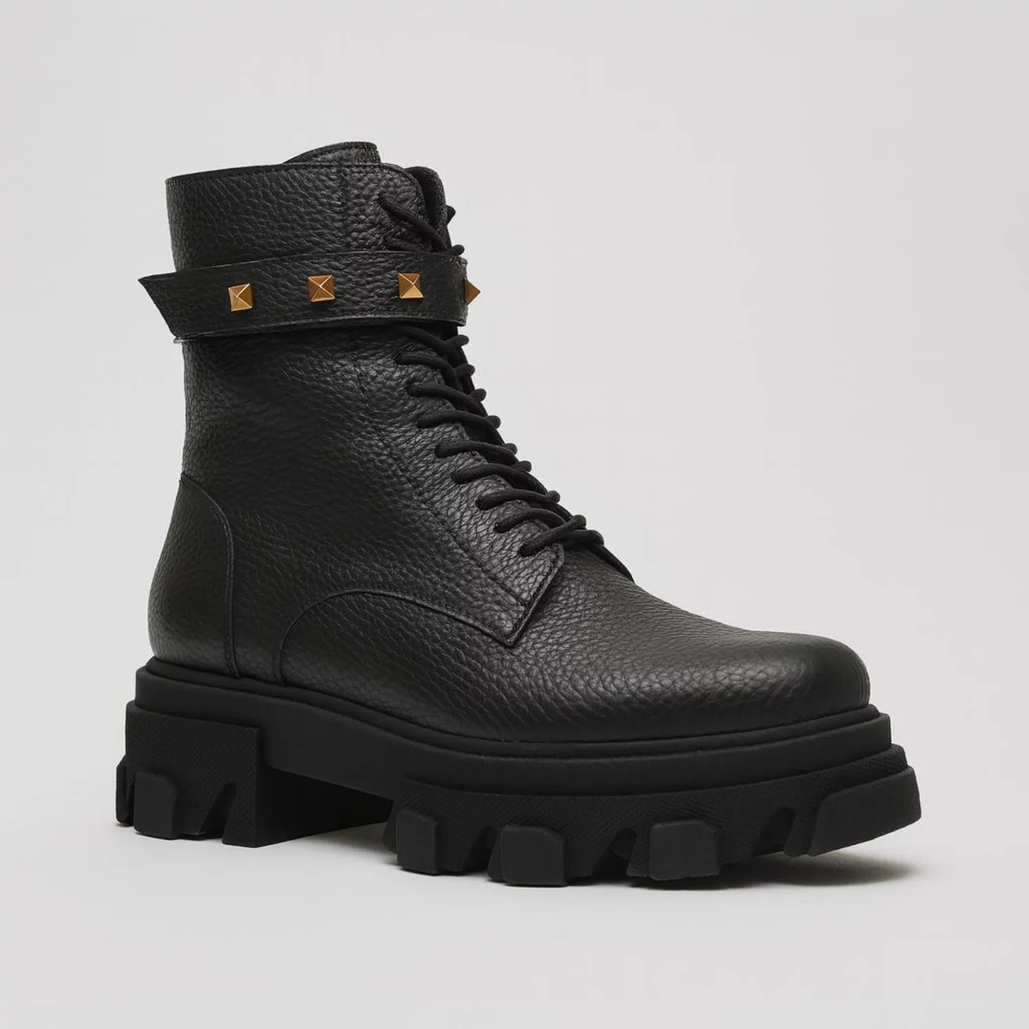 Completează-ți garderoba cu ghetele Nova, un model modern și versatil, realizat integral din piele naturală neagră cu textură premium. Aceste ghete impun prin talpa masivă, designul contemporan și detaliile metalice aurii care adaugă un plus de personalitate fiecărei ținute.