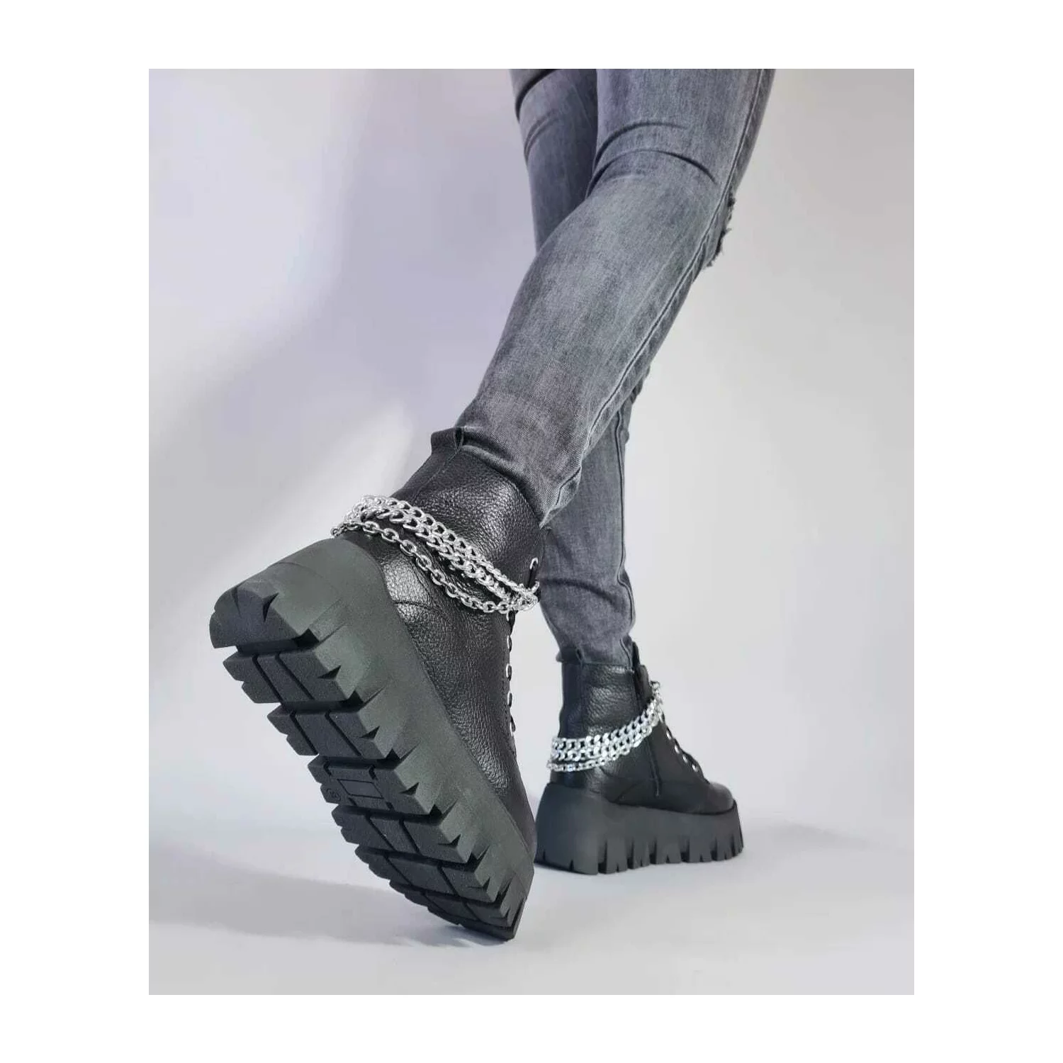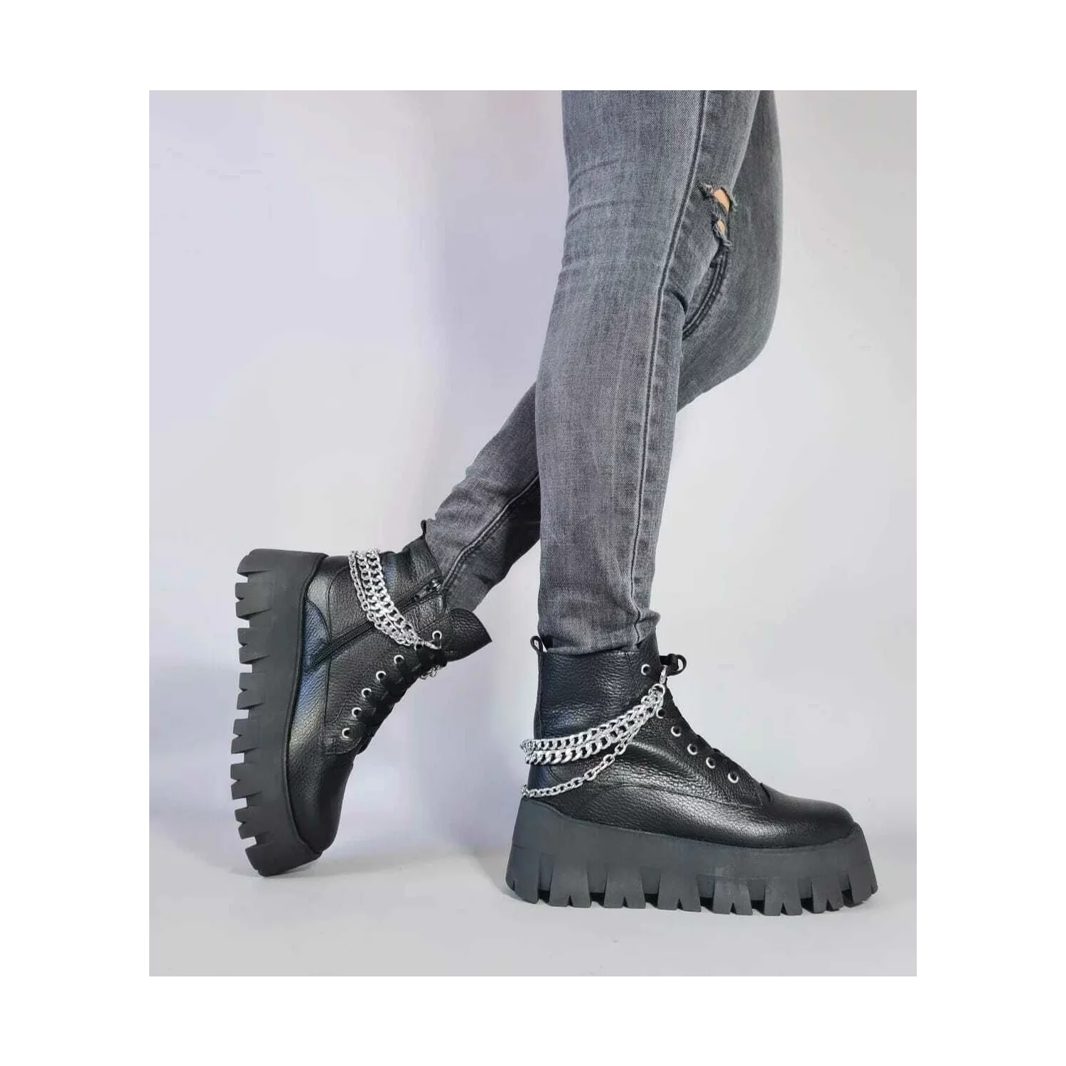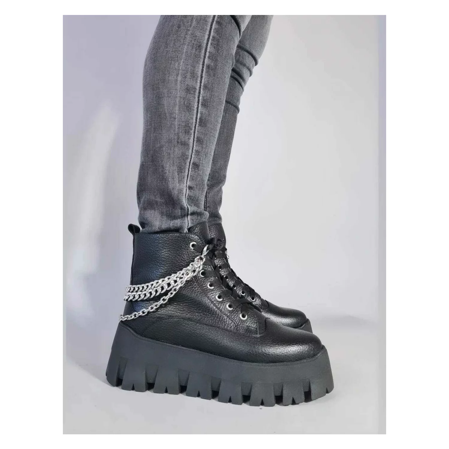 - Ghete de dama tip bocanc din piele naturala cu siret si fermoar pe interior accesorizate cu lant detasabil.