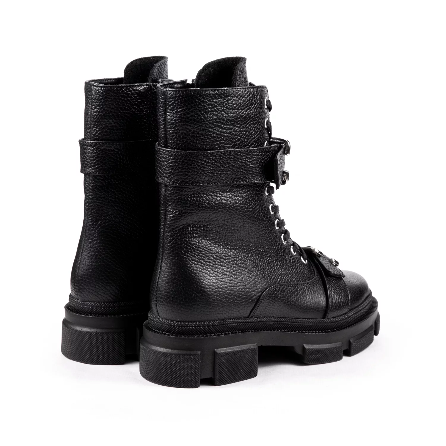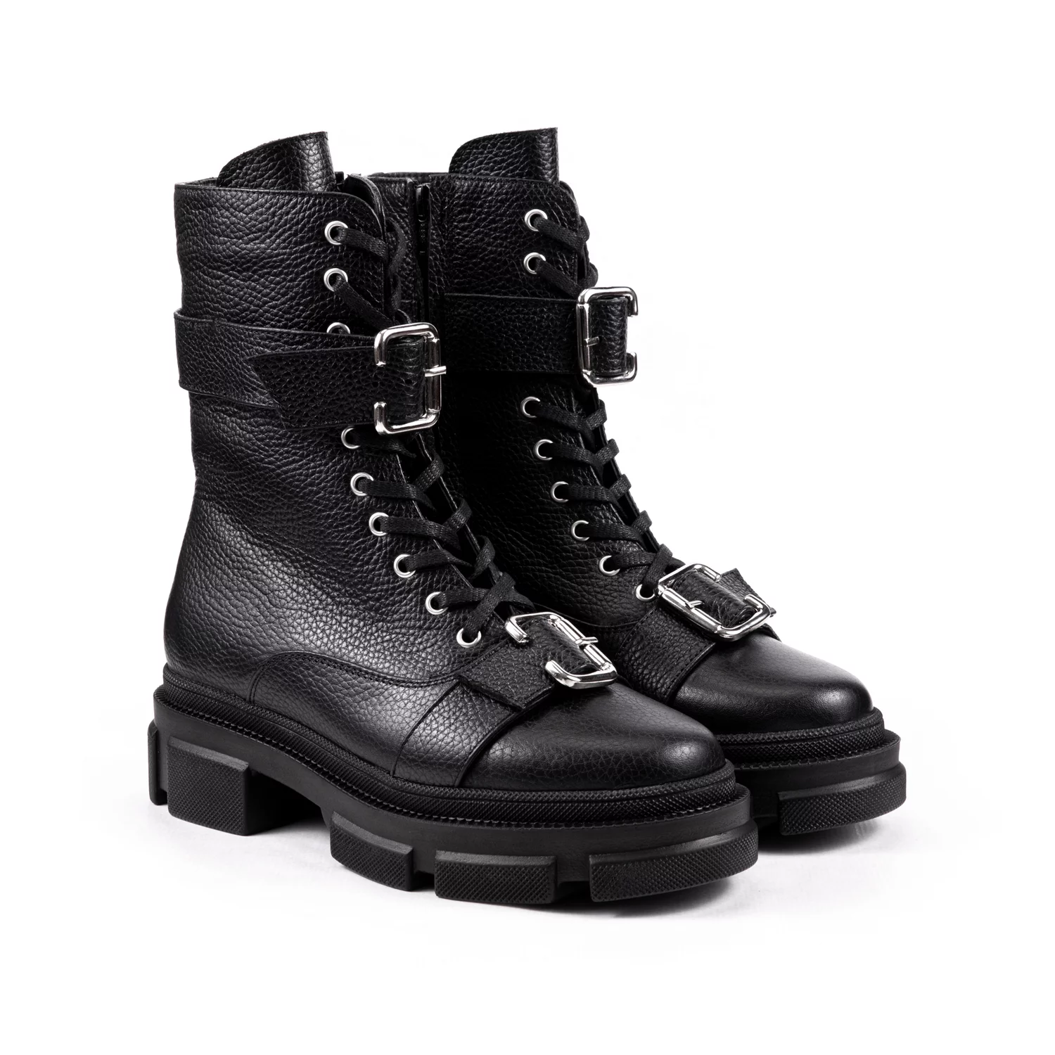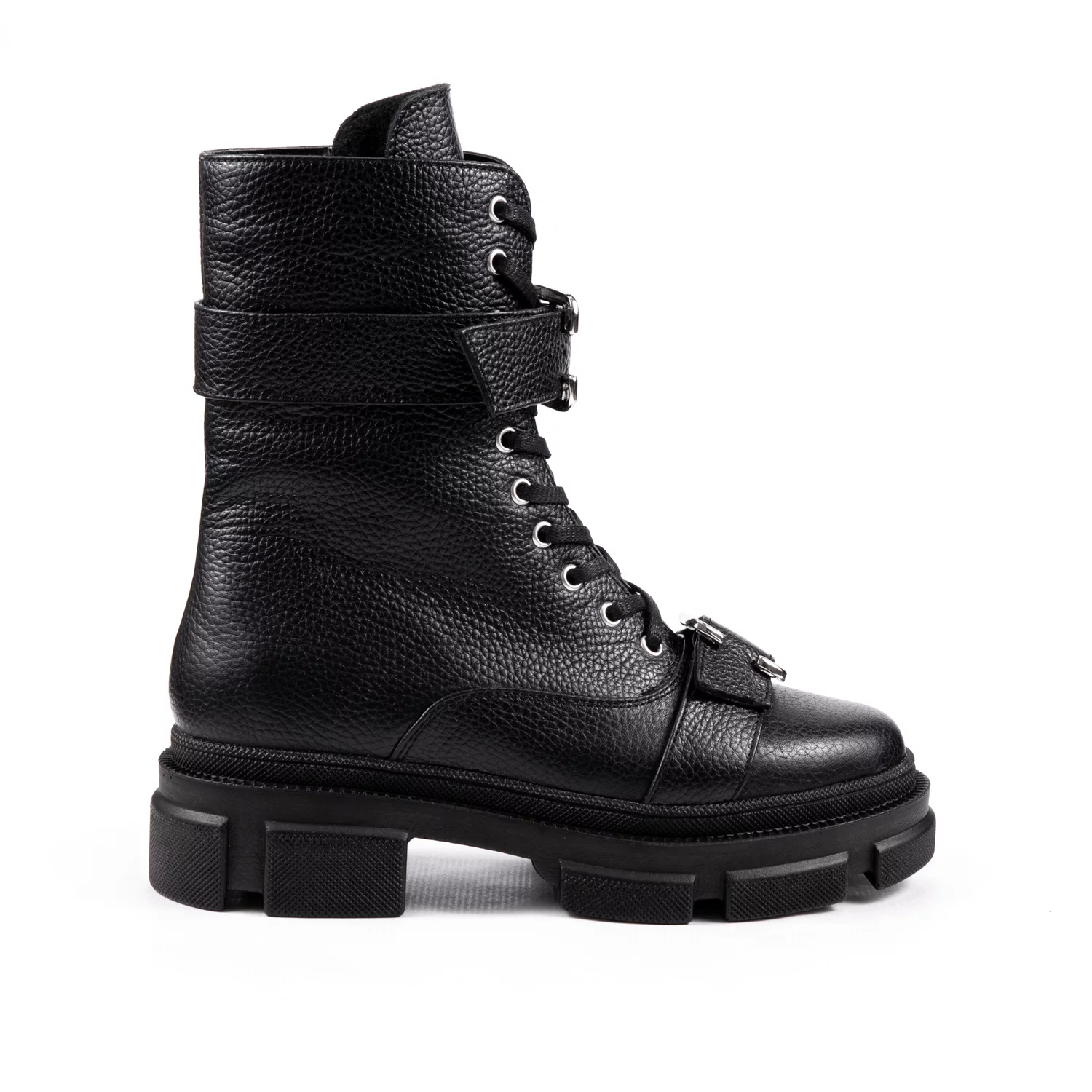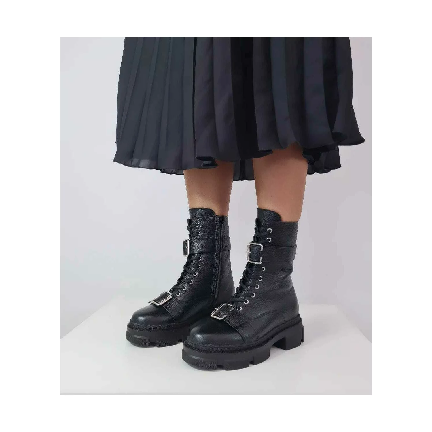 - Ghete de dama tip bocanci din piele naturala acesorizate cu capse si catarame argintii.