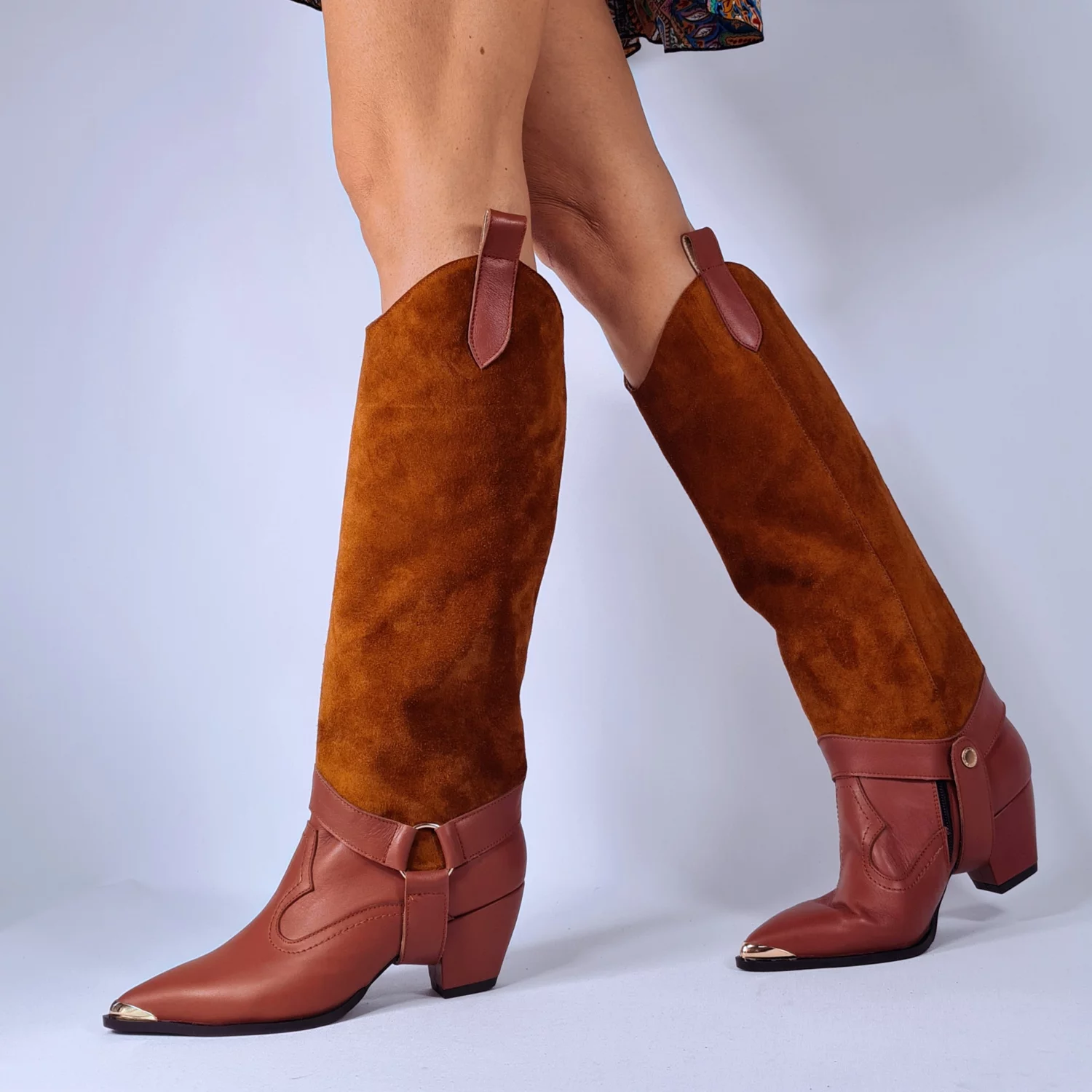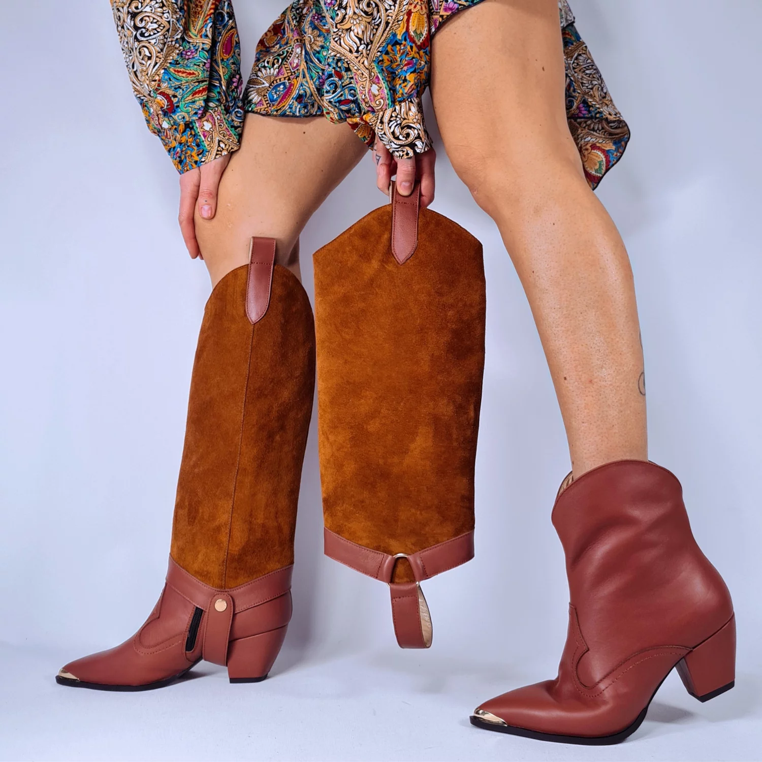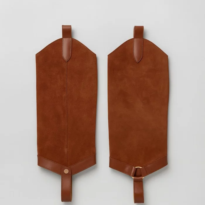 Jampiere din piele naturală, fixare cu capse la interior. Pot fi purtate cu orice ghete, transformându-le rapid în cizme elegante și practice.