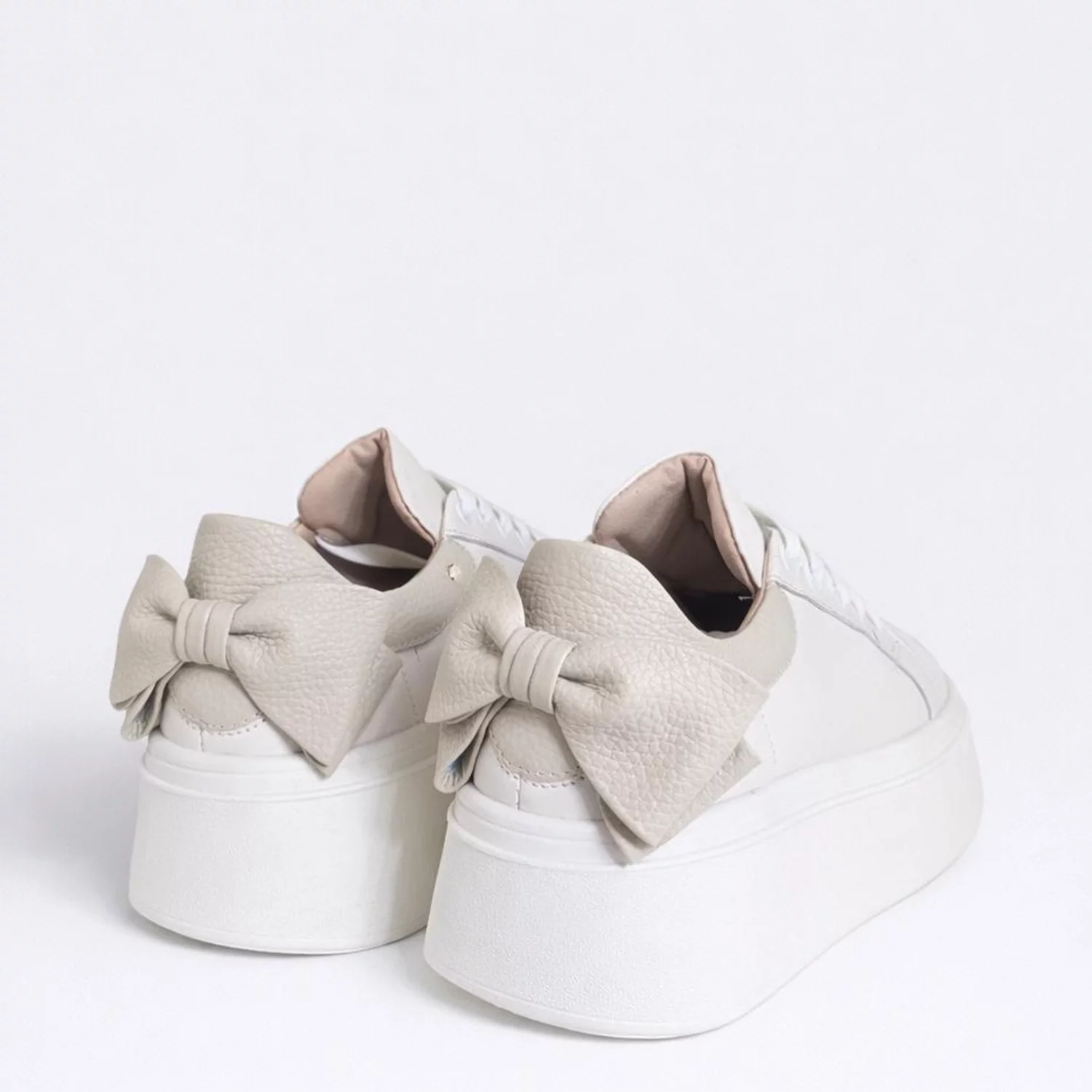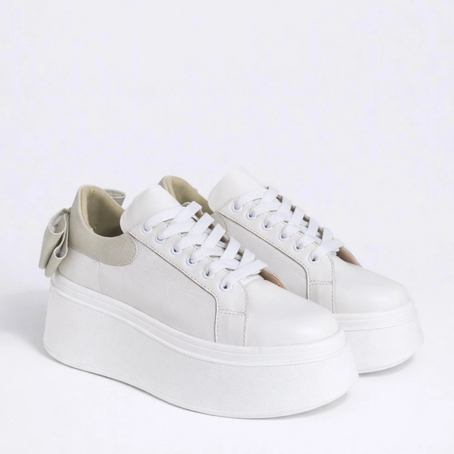 Pantofi casual Piele Naturala Albi cu Bej Bow