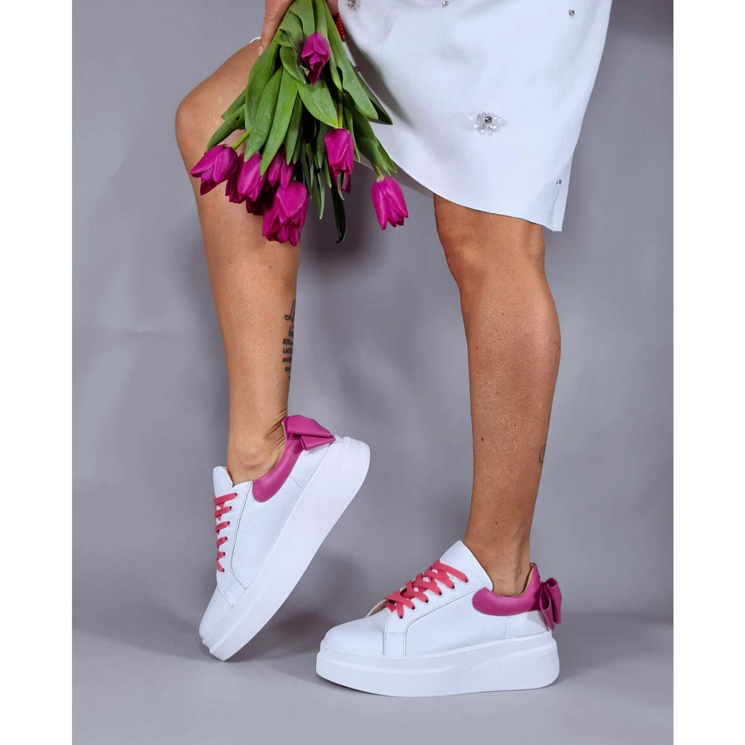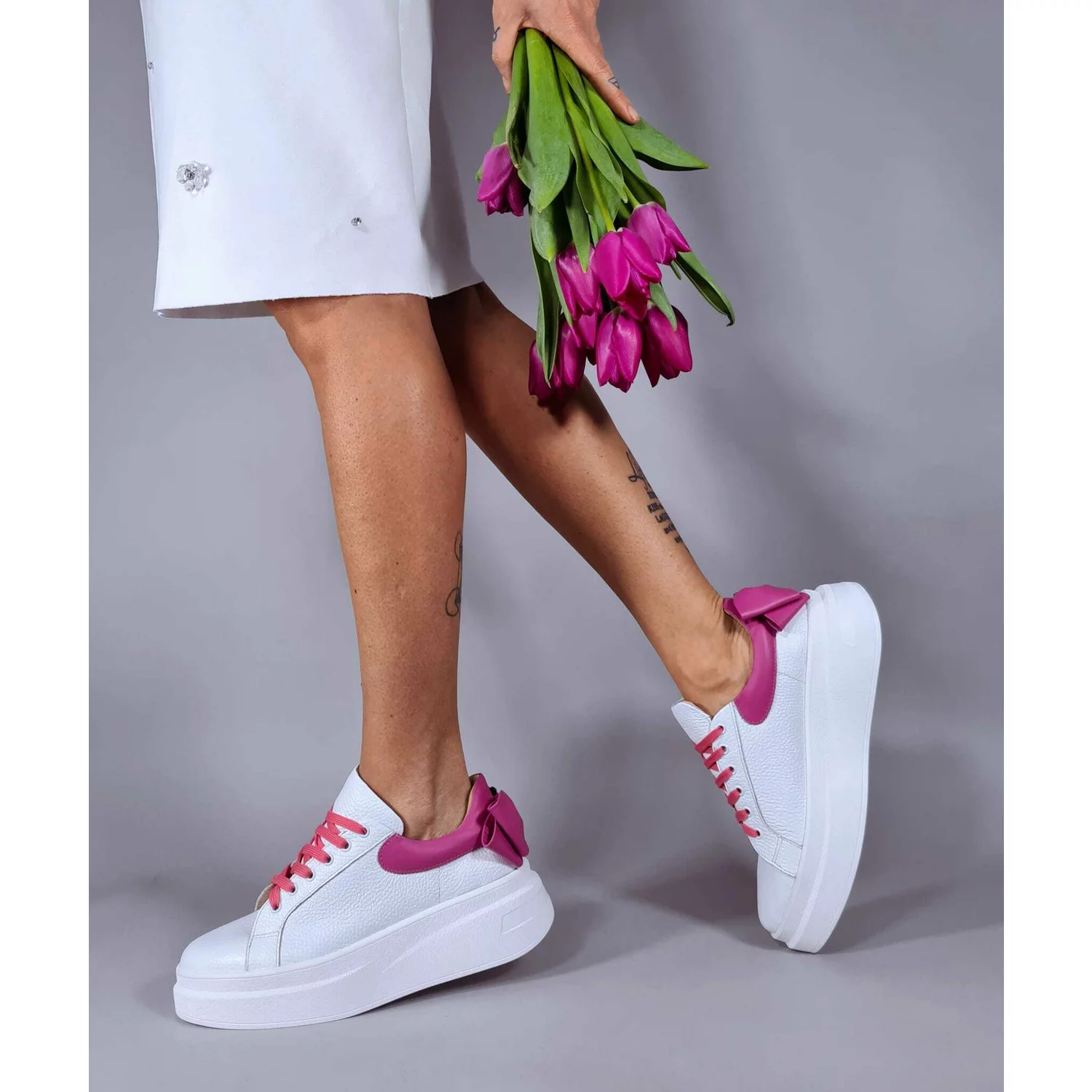 Pantofi casual Piele Naturala Albi cu Fuxia Bow