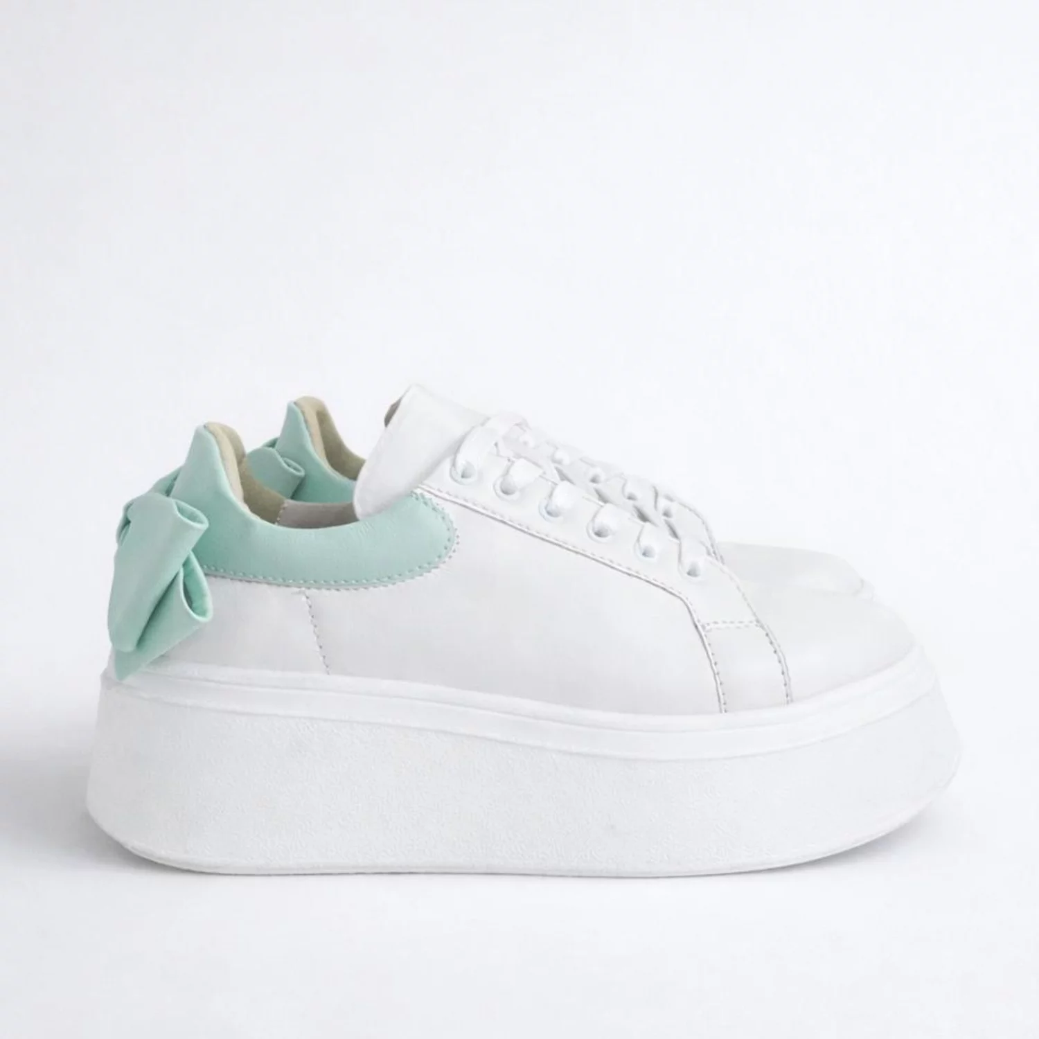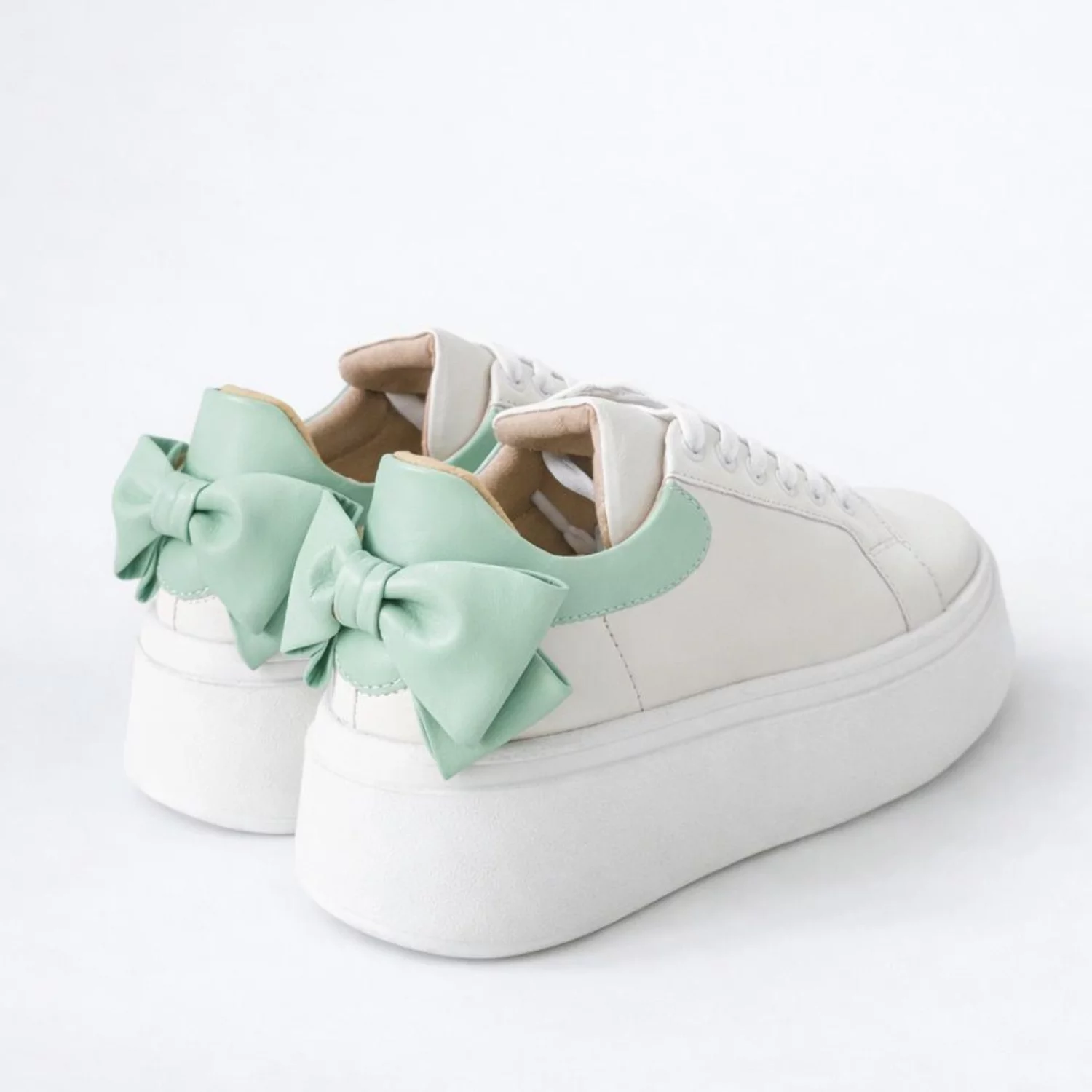 Feminin, fresh și ușor de remarcat! Pantofii casual Bow din piele naturală box off-white cu verde turcoaz. oferă confort și stil în fiecare zi. Interior din piele, mărimi 34–40. Producător Garkony