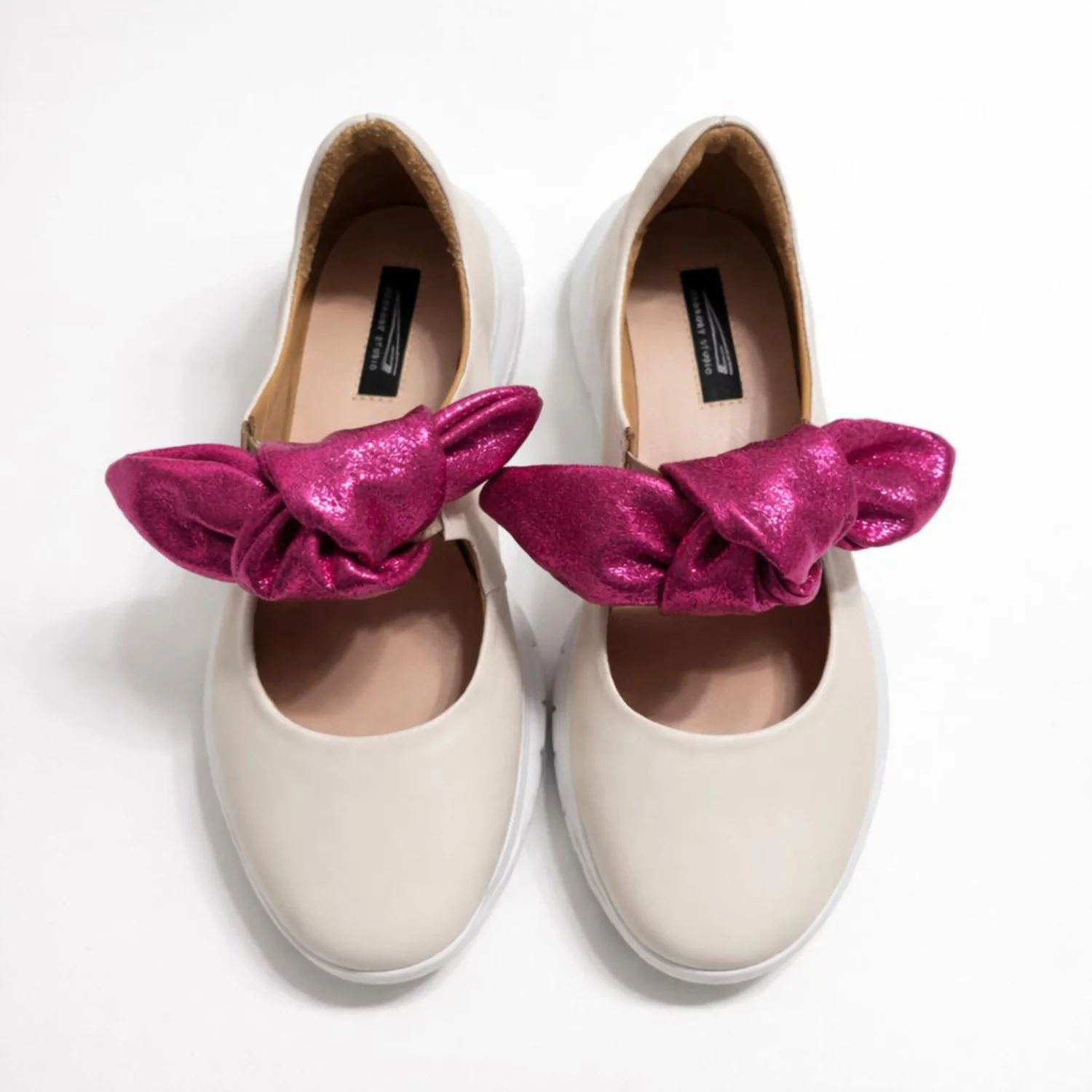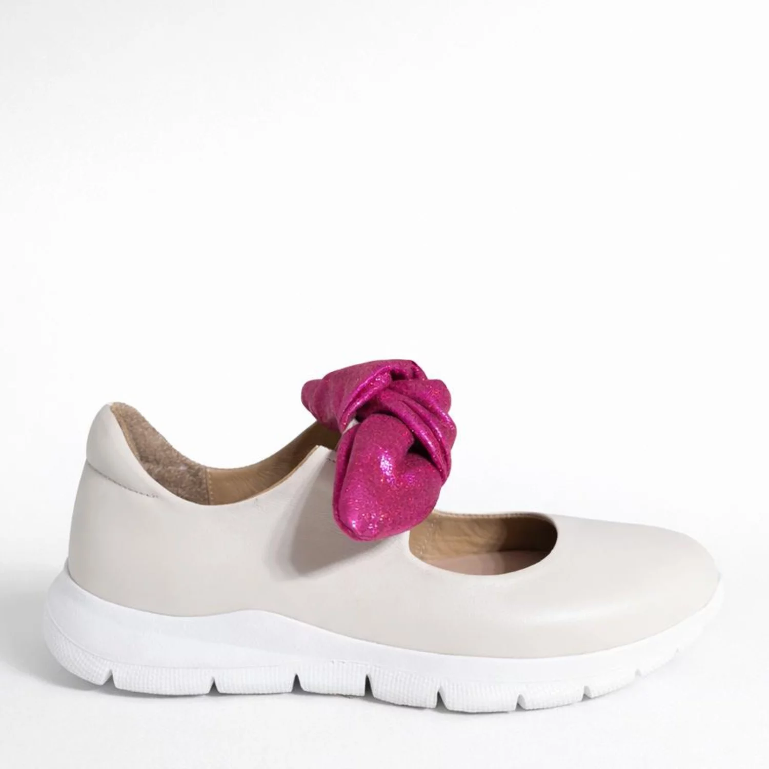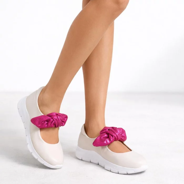 Pantofi casual Piele Naturala Crem cu fuxia Mini Bow
