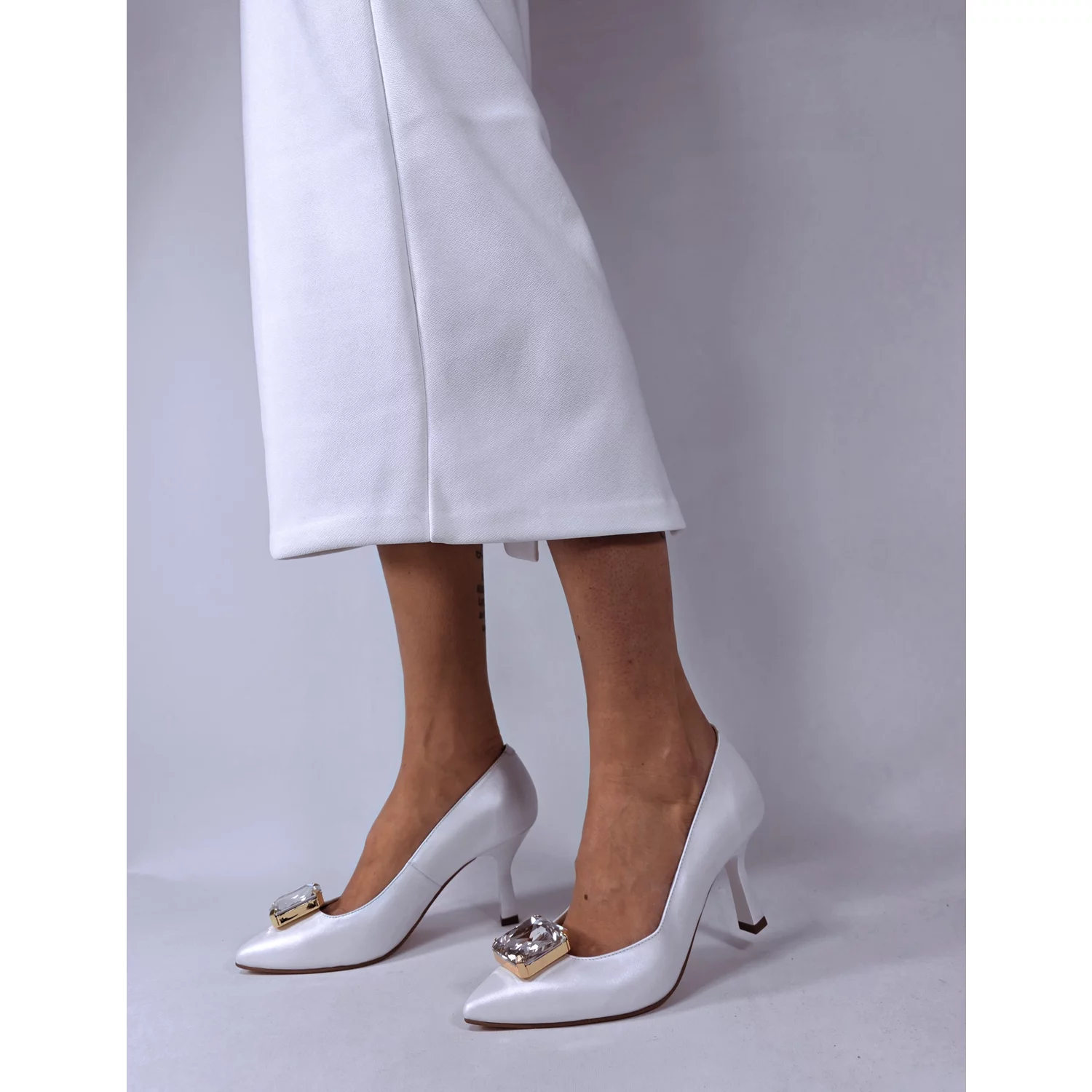 Pantofi stiletto Piele Naturala Albi cu accesorii pietre detasabile Vittoria