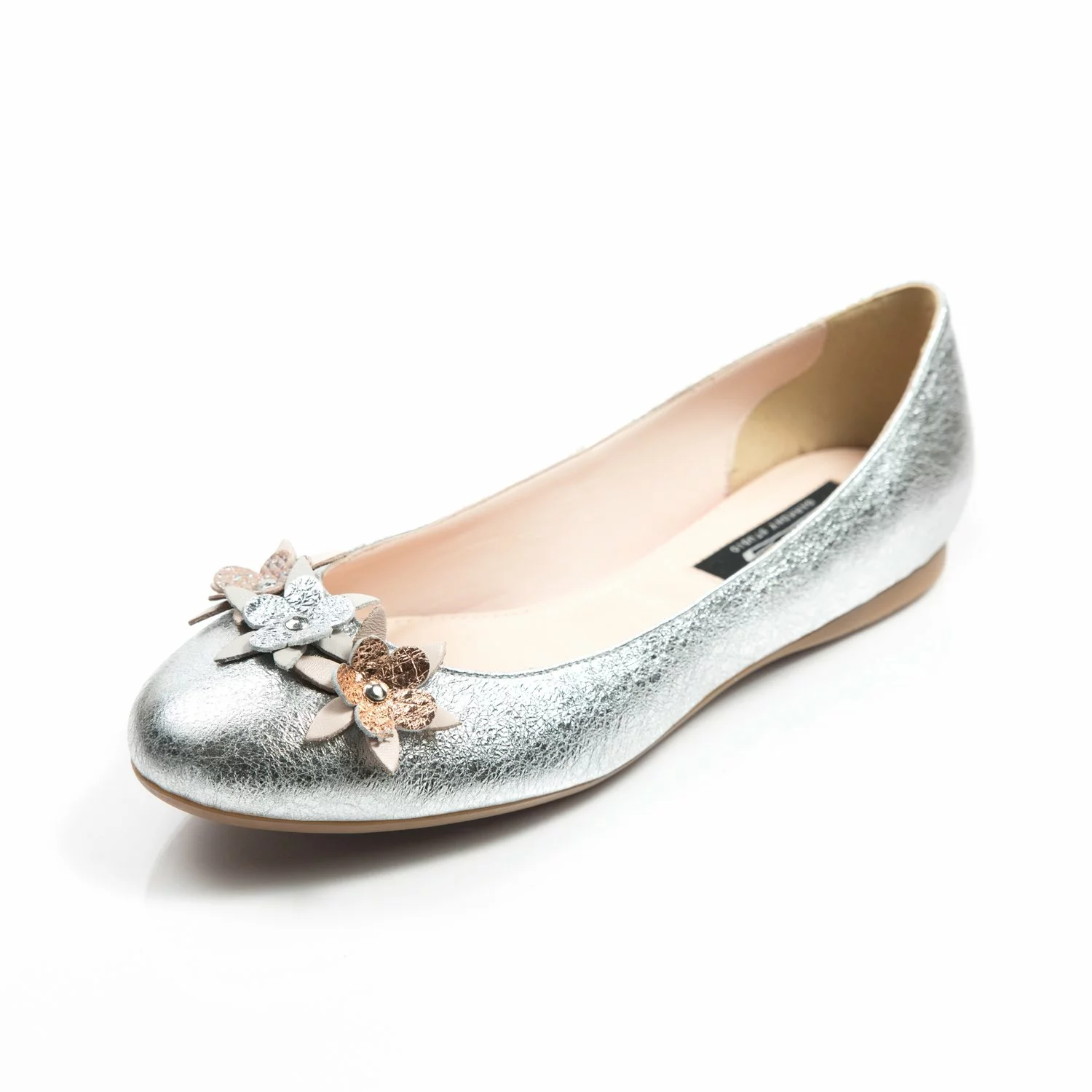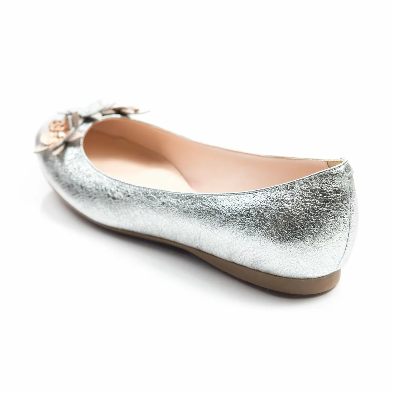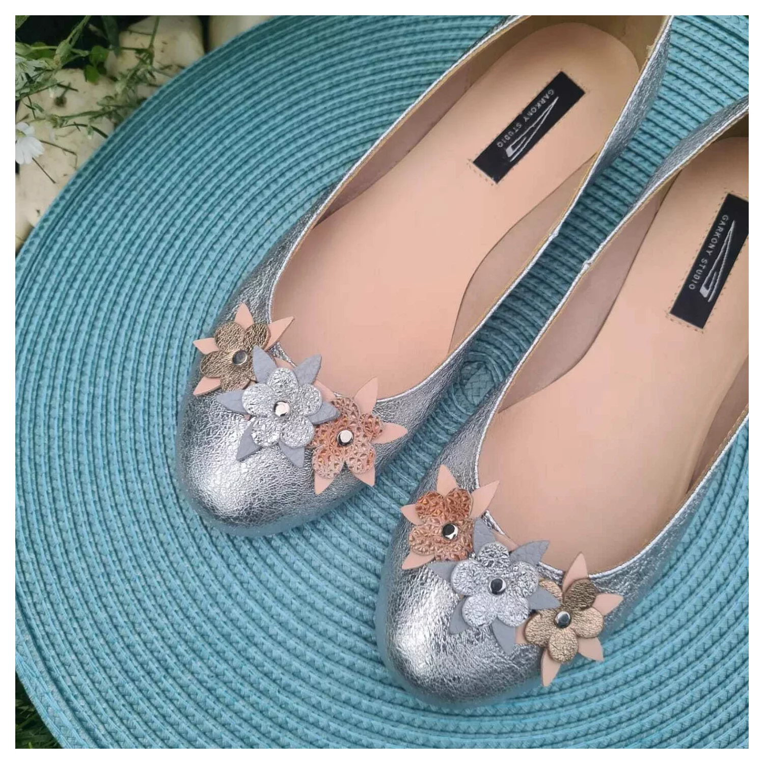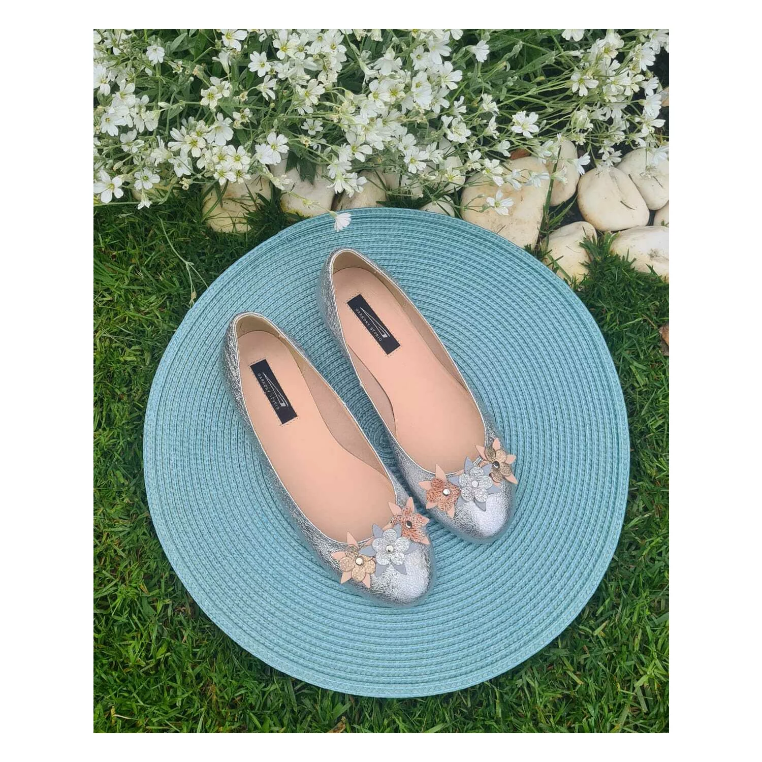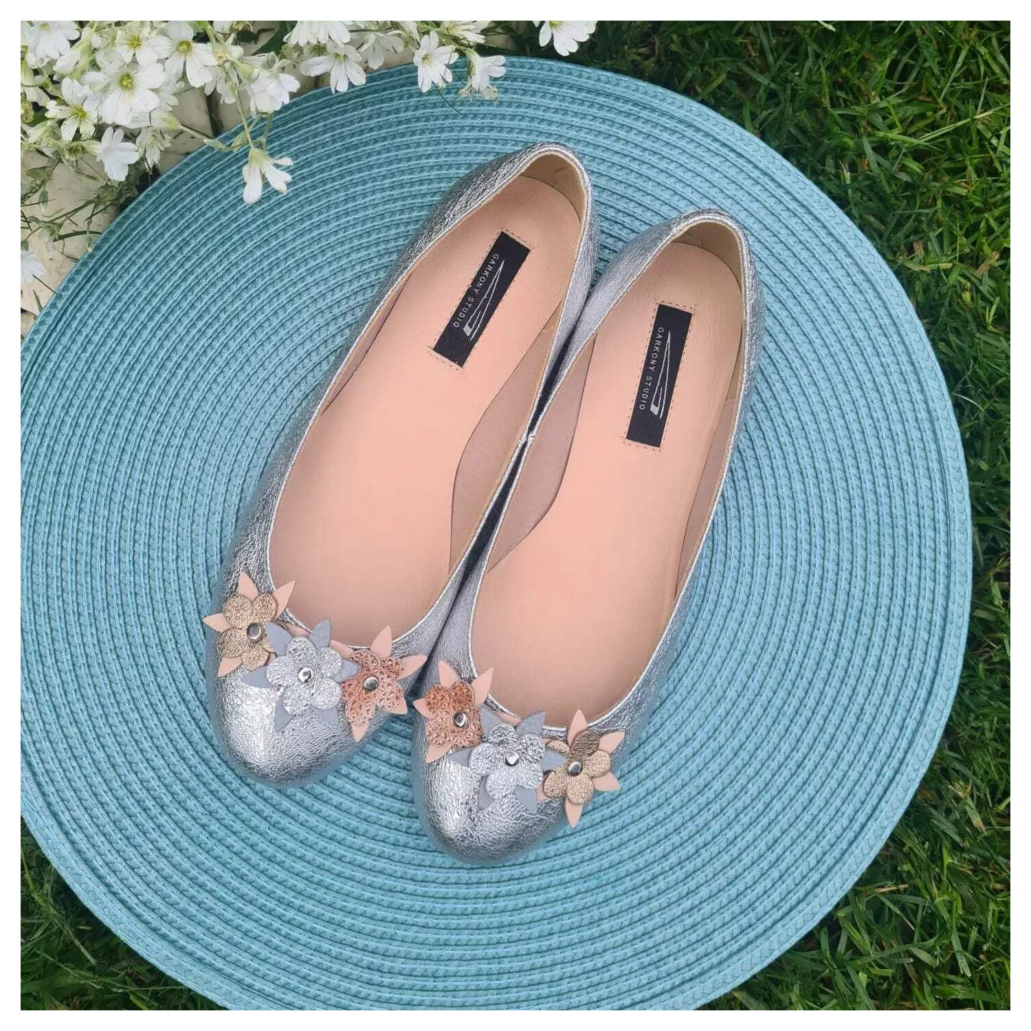 Balerini cu varf rotund si model floral din piele naturala argintie.Confectionati manual din piele naturala exterior si interior. Brantul este din piele naturala si este prevazut cu un buret special care ofera un plus de comoditate.