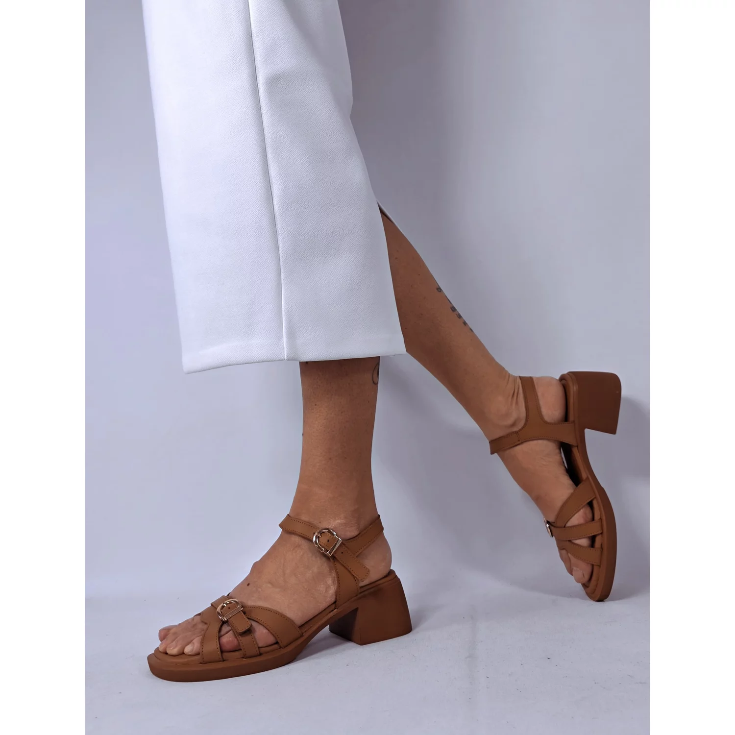 - Sandale de dama din piele naturala Maro coniac cu accesorii aurii.